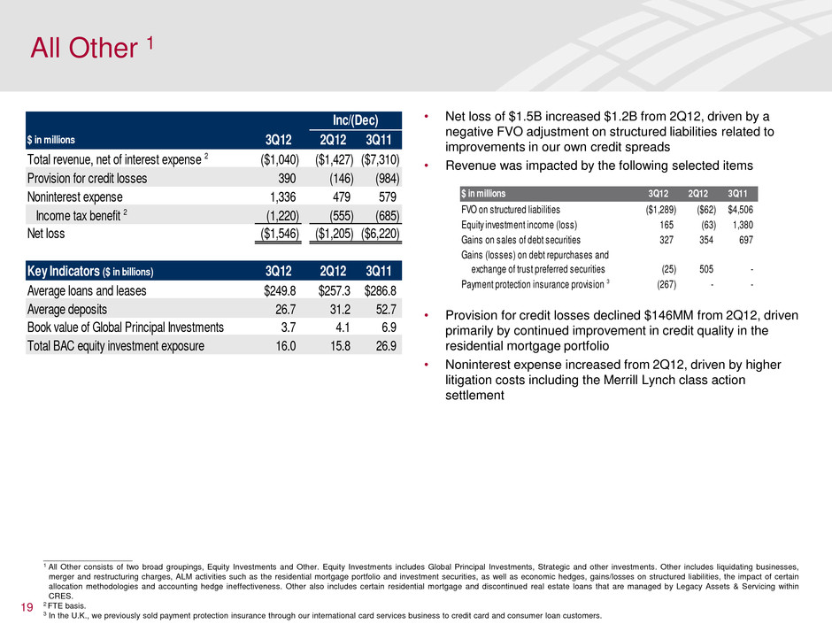 • Net loss of $1.5B increased $1.2B from 2Q12, driven by a negative FVO adjustment on structured liabilities related to improvements in our own credit spreads • Revenue was impacted by the following selected items • Provision for credit losses declined $146MM from 2Q12, driven primarily by continued improvement in credit quality in the residential mortgage portfolio • Noninterest expense increased from 2Q12, driven by higher litigation costs including the Merrill Lynch class action settlement ____________________ 1 All Other consists of two broad groupings, Equity Investments and Other. Equity Investments includes Global Principal Investments, Strategic and other investments. Other includes liquidating businesses, merger and restructuring charges, ALM activities such as the residential mortgage portfolio and investment securities, as well as economic hedges, gains/losses on structured liabilities, the impact of certain allocation methodologies and accounting hedge ineffectiveness. Other also includes certain residential mortgage and discontinued real estate loans that are managed by Legacy Assets & Servicing within CRES. 2 FTE basis. 3 In the U.K., we previously sold payment protection insurance through our international card services business to credit card and consumer loan customers. 19 All Other 1 $ in millions 2Q12 3Q11 Total revenue, net of interest expense 2 ($1,040) ($1,427) ($7,310) Provision for credit losses 390 (146) (984) Noninterest expense 1,336 479 579 Income tax benefit 2 (1,220) (555) (685) Net loss ($1,546) ($1,205) ($6,220) Key Indicators ($ in billions) 3Q12 2Q12 3Q11 Average loans and leases $249.8 $257.3 $286.8 Average deposits 26.7 31.2 52.7 Book value of Global Principal Investments 3.7 4.1 6.9 Total BAC equity inv stm nt xposure 16.0 15.8 26.9 Inc/(Dec) 3Q12 $ in millions 3Q12 2Q12 3Q11 FVO on tructured liabilities ($1,289) ($62) $4,506 Equity investment income (loss) 165 (63) 1,380 Gains on sales of debt securities 327 354 697 (25) 505 - Payment protection i surance provision 3 (267) - - Gains (losses) on debt repurchases and exchange of trust preferred securities