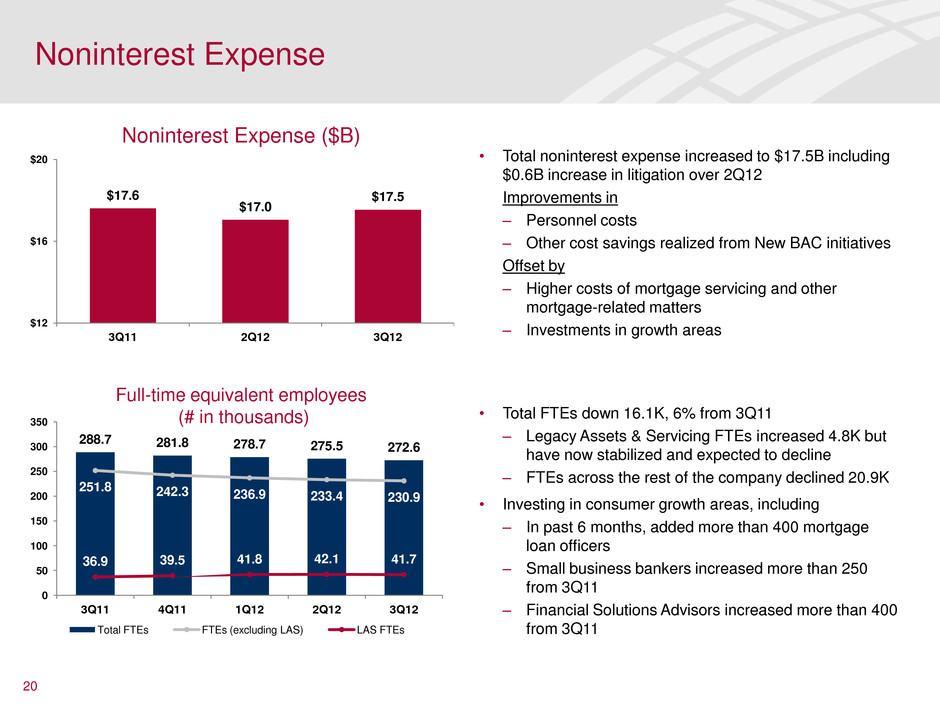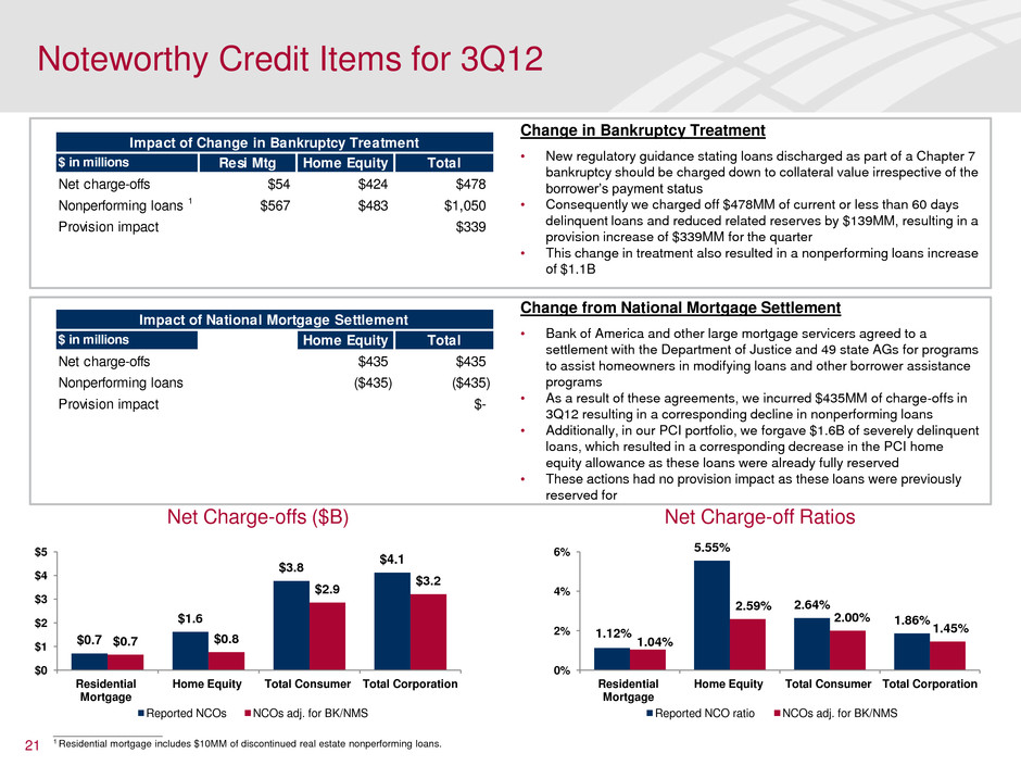 Noninterest Expense Noninterest Expense ($B) 20 288.7 281.8 278.7 275.5 272.6 251.8 242.3 236.9 233.4 230.9 36.9 39.5 41.8 42.1 41.7 0 50 100 150 200 250 300 350 3Q11 4Q11 1Q12 2Q12 3Q12 Total FTEs FTEs (excluding LAS) LAS FTEs Full-time equivalent employees (# in thousands) $17.6 $17.0 $17.5 $12 $16 $20 3Q11 2Q12 3Q12 • Total FTEs down 16.1K, 6% from 3Q11 – Legacy Assets & Servicing FTEs increased 4.8K but have now stabilized and expected to decline – FTEs across the rest of the company declined 20.9K • Investing in consumer growth areas, including – In past 6 months, added more than 400 mortgage loan officers – Small business bankers increased more than 250 from 3Q11 – Financial Solutions Advisors increased more than 400 from 3Q11 • Total noninterest expense increased to $17.5B including $0.6B increase in litigation over 2Q12 Improvements in – Personnel costs – Other cost savings realized from New BAC initiatives Offset by – Higher costs of mortgage servicing and other mortgage-related matters – Investments in growth areas