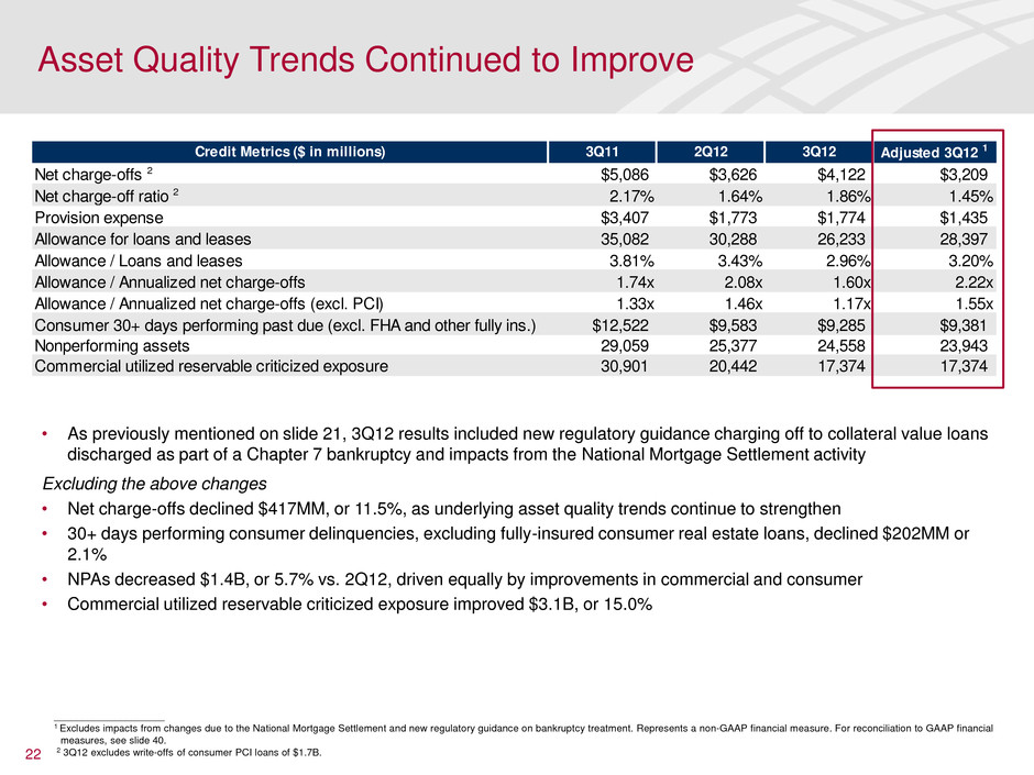 Noteworthy Credit Items for 3Q12 21 $0.7 $1.6 $3.8 $4.1 $0.7 $0.8 $2.9 $3.2 $0 $1 $2 $3 $4 $5 Residential Mortgage Home Equity Total Consumer Total Corporation Reported NCOs NCOs adj. for BK/NMS Net Charge-offs ($B) 1.12% 5.55% 2.64% 1.86% 1.04% 2.59% 2.00% 1.45% 0% 2% 4% 6% Residential Mortgage Home Equity Total Consumer Total Corporation Reported NCO ratio NCOs adj. for BK/NMS Net Charge-off Ratios Change in Bankruptcy Treatment • New regulatory guidance stating loans discharged as part of a Chapter 7 bankruptcy should be charged down to collateral value irrespective of the borrower’s payment status • Consequently we charged off $478MM of current or less than 60 days delinquent loans and reduced related reserves by $139MM, resulting in a provision increase of $339MM for the quarter • This change in treatment also resulted in a nonperforming loans increase of $1.1B Change from National Mortgage Settlement • Bank of America and other large mortgage servicers agreed to a settlement with the Department of Justice and 49 state AGs for programs to assist homeowners in modifying loans and other borrower assistance programs • As a result of these agreements, we incurred $435MM of charge-offs in 3Q12 resulting in a corresponding decline in nonperforming loans • Additionally, in our PCI portfolio, we forgave $1.6B of severely delinquent loans, which resulted in a corresponding decrease in the PCI home equity allowance as these loans were already fully reserved • These actions had no provision impact as these loans were previously reserved for $ in millions Resi Mtg Home Equity Total Net charge-offs $54 $424 $478 Nonperforming loans 1 $567 $483 $1,050 Provision impact $339 Impact of Change in Bankruptcy Treatment $ in millions Resi Mtg Home Equity Total Net charge-offs $435 $435 Nonperforming loans ($435) ($435) Provision impact $- Impact of National Mortgage Settlement ____________________ 1 Residential mortgage includes $10MM of discontinued real estate nonperforming loans.