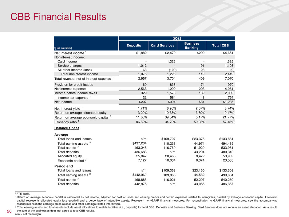 ____________________ 1 FTE basis. FTE basis for the Total Corporation and pre-tax, pre-provision are non-GAAP financial measures. 2 For reconciliations to GAAP financial measures, see the accompanying reconciliations in the earnings press release and other earnings-related information. 25 3Q12 Results by Business Segment $ in millions Total Corporation CBB CRES GWIM Global Banking Global Markets All Other Net interest income 1, 2 $10,167 $4,651 $729 $1,458 $2,264 $846 $219 Card income 1,538 1,325 - 2 118 - 93 Service charges 1,934 1,103 - 22 796 13 - Investment and brokerage services 2,781 42 - 2,293 32 425 (11) Investment banking income (loss) 1,336 1 - 152 662 553 (32) Equity investment income (loss) 238 30 - 8 (17) 52 165 Trading account profits (losses) 1,239 - 1 39 (24) 1,238 (15) Mortgage banking income (loss) 2,019 - 2,192 7 1 (3) (178) Insurance income (loss) (138) 25 1 81 - - (245) Gains on sales of debt securities 339 - - - 3 9 327 All other income (loss) (796) (107) 173 216 312 (27) (1,363) Total noninterest income 10,490 2,419 2,367 2,820 1,883 2,260 (1,259) Total revenue, net of interest expense 1, 2 20,657 7,070 3,096 4,278 4,147 3,106 (1,040) Total noninterest expense 17,544 4,061 4,224 3,355 2,023 2,545 1,336 Pre-tax, pre-provision earnings (loss) 1 3,113 3,009 (1,128) 923 2,124 561 (2,376) Provision for credit losses 1,774 970 264 61 68 21 390 Income (loss) before income taxes 1,339 2,039 (1,392) 862 2,056 540 (2,766) Income tax expense (benefit) 1, 2 999 754 (515) 320 761 899 (1,220) Net income (loss) $340 $1,285 ($877) $542 $1,295 ($359) ($1,546)