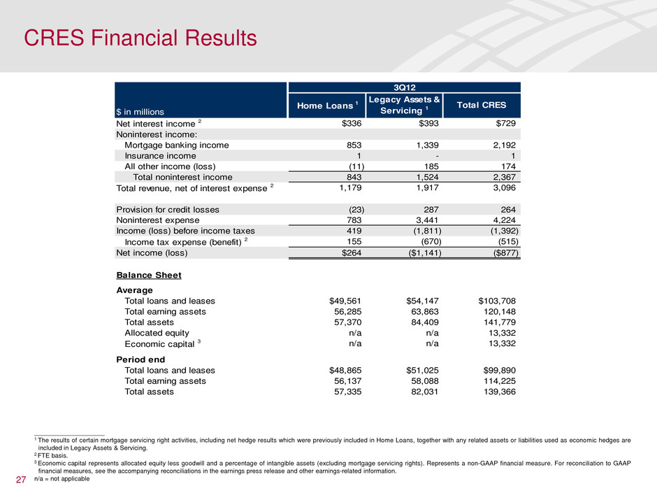 27 ____________________ 1 The results of certain mortgage servicing right activities, including net hedge results which were previously included in Home Loans, together with any related assets or liabilities used as economic hedges are included in Legacy Assets & Servicing. 2 FTE basis. 3 Economic capital represents allocated equity less goodwill and a percentage of intangible assets (excluding mortgage servicing rights). Represents a non-GAAP financial measure. For reconciliation to GAAP financial measures, see the accompanying reconciliations in the earnings press release and other earnings-related information. n/a = not applicable CRES Financial Results Net interest income 2 $336 $393 $729 Noninterest income: Mortgage banking income 853 1,339 2,192 Insurance income 1 - 1 All other income (loss) (11) 185 174 Total noninterest income 843 1,524 2,367 Total revenue, net of interest expense 2 1,179 1,917 3,096 Provision for credit losses (23) 287 264 Noninterest expense 783 3,441 4,224 Income (loss) before income taxes 419 (1,811) (1,392) Income tax expense (benefit) 2 155 (670) (515) Net income (loss) $264 ($1,141) ($877) Balance Sheet Average Total loans and leases $49,561 $54,147 $103,708 Total earning assets 56,285 63,863 120,148 Total assets 57,370 84,409 141,779 Allocated equity n/a n/a 13,332 Economic capital 3 n/a n/a 13,332 Period end Total loans and leases $48,865 $51,025 $99,890 Total earning assets 56,137 58,088 114,225 Total assets 57,335 82,031 139,366 $ in millions Total CRESHome Loans 1 Legacy Assets & Servicing 1 3Q12