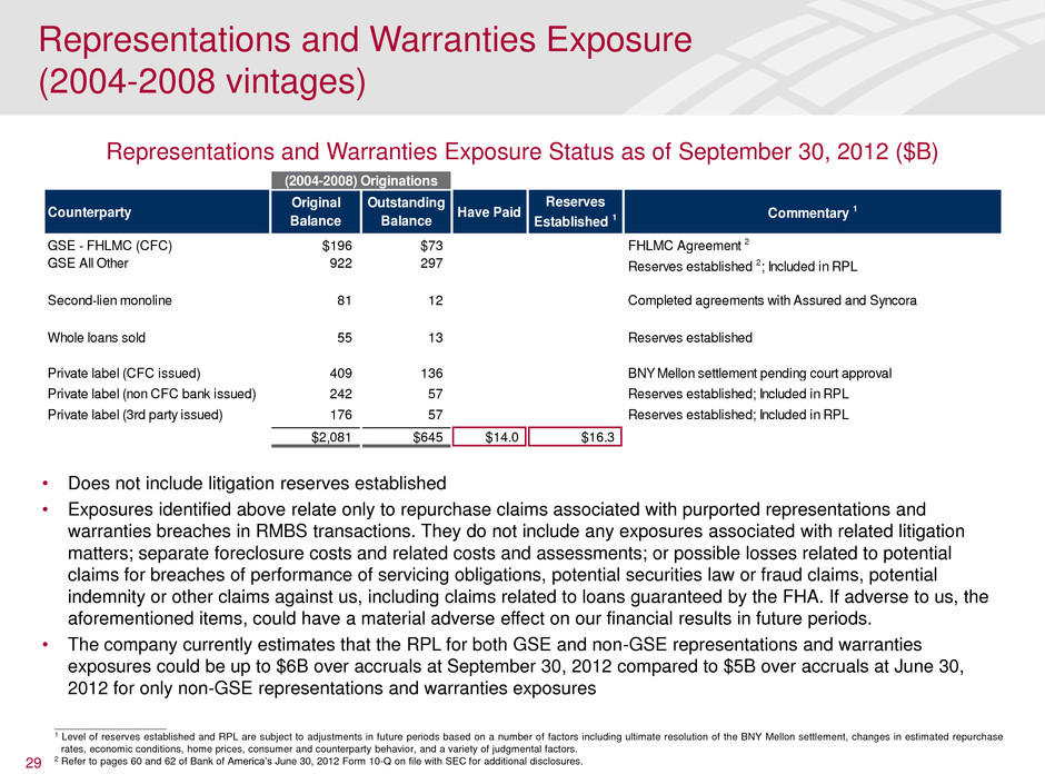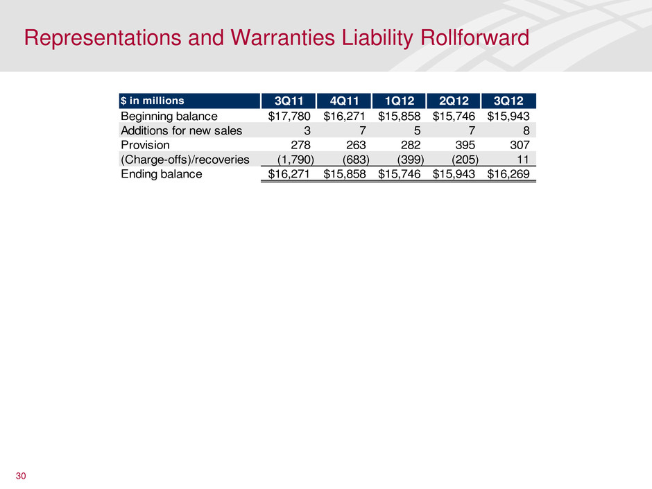 • Does not include litigation reserves established • Exposures identified above relate only to repurchase claims associated with purported representations and warranties breaches in RMBS transactions. They do not include any exposures associated with related litigation matters; separate foreclosure costs and related costs and assessments; or possible losses related to potential claims for breaches of performance of servicing obligations, potential securities law or fraud claims, potential indemnity or other claims against us, including claims related to loans guaranteed by the FHA. If adverse to us, the aforementioned items, could have a material adverse effect on our financial results in future periods. • The company currently estimates that the RPL for both GSE and non-GSE representations and warranties exposures could be up to $6B over accruals at September 30, 2012 compared to $5B over accruals at June 30, 2012 for only non-GSE representations and warranties exposures 29 ____________________ 1 Level of reserves established and RPL are subject to adjustments in future periods based on a number of factors including ultimate resolution of the BNY Mellon settlement, changes in estimated repurchase rates, economic conditions, home prices, consumer and counterparty behavior, and a variety of judgmental factors. 2 Refer to pages 60 and 62 of Bank of America’s June 30, 2012 Form 10-Q on file with SEC for additional disclosures. Representations and Warranties Exposure Status as of September 30, 2012 ($B) Representations and Warranties Exposure (2004-2008 vintages) Counterparty Original Balance Outstanding Balance Have Paid Reserves Established 1 Commentary 1 GSE - FHLMC (CFC) $196 $73 FHLMC Agreement 2 GSE All Other 922 297 Reserves established 2; Included in RPL Second-lien monoline 81 12 Completed agreements with Assured and Syncora Whole loans sold 55 13 Reserves established Privat label (CFC issued) 409 136 BNY Mellon settlement pending court approval Pr vate l bel (non CFC bank issued) 242 57 Reserves established; Included in RPL Private label (3rd party issued) 176 57 Reserves established; Included in RPL $2,081 $645 $14.0 $16.3 (2004-2008) Originations