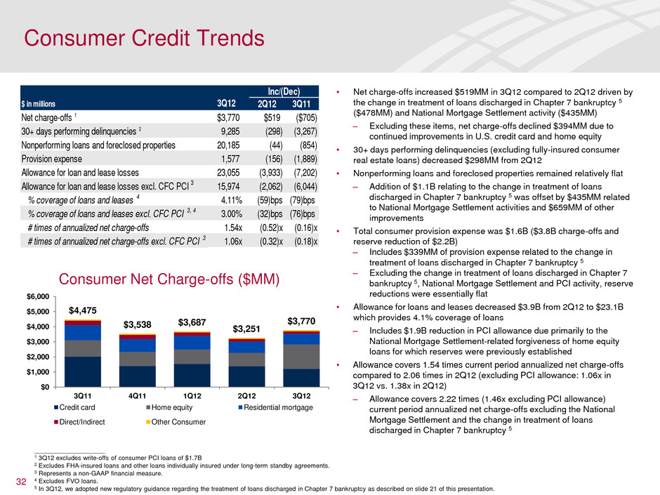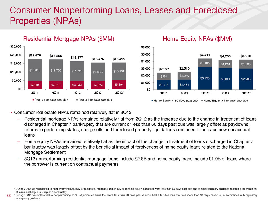 • Net charge-offs increased $519MM in 3Q12 compared to 2Q12 driven by the change in treatment of loans discharged in Chapter 7 bankruptcy 5 ($478MM) and National Mortgage Settlement activity ($435MM) – Excluding these items, net charge-offs declined $394MM due to continued improvements in U.S. credit card and home equity • 30+ days performing delinquencies (excluding fully-insured consumer real estate loans) decreased $298MM from 2Q12 • Nonperforming loans and foreclosed properties remained relatively flat – Addition of $1.1B relating to the change in treatment of loans discharged in Chapter 7 bankruptcy 5 was offset by $435MM related to National Mortgage Settlement activities and $659MM of other improvements • Total consumer provision expense was $1.6B ($3.8B charge-offs and reserve reduction of $2.2B) – Includes $339MM of provision expense related to the change in treatment of loans discharged in Chapter 7 bankruptcy 5 – Excluding the change in treatment of loans discharged in Chapter 7 bankruptcy 5, National Mortgage Settlement and PCI activity, reserve reductions were essentially flat • Allowance for loans and leases decreased $3.9B from 2Q12 to $23.1B which provides 4.1% coverage of loans – Includes $1.9B reduction in PCI allowance due primarily to the National Mortgage Settlement-related forgiveness of home equity loans for which reserves were previously established • Allowance covers 1.54 times current period annualized net charge-offs compared to 2.06 times in 2Q12 (excluding PCI allowance: 1.06x in 3Q12 vs. 1.38x in 2Q12) – Allowance covers 2.22 times (1.46x excluding PCI allowance) current period annualized net charge-offs excluding the National Mortgage Settlement and the change in treatment of loans discharged in Chapter 7 bankruptcy 5 32 ____________________ 1 3Q12 excludes write-offs of consumer PCI loans of $1.7B 2 Excludes FHA-insured loans and other loans individually insured under long-term standby agreements. 3 Represents a non-GAAP financial measure. 4 Excludes FVO loans. 5 In 3Q12, we adopted new regulatory guidance regarding the treatment of loans discharged in Chapter 7 bankruptcy as described on slide 21 of this presentation. Consumer Credit Trends $ in millions 2Q12 3Q11 Net charge-offs 1 $3,770 $519 ($705) 30+ days performing delinquencies 2 9,285 (298) (3,267) Nonperforming loans and foreclosed properties 20,185 (44) (854) Provision expense 1,577 (156) (1,889) Allowance for loan and lease losses 23,055 (3,933) (7,202) Allowance for loan and lease losses excl. CFC PCI 3 15,974 (2,062) (6,044) % coverage of loan and leases 4 4.11% (59)bps (79)bps % coverage of loans and l ses excl. CFC PCI 3, 4 3.00% (32)bps (76)bps # times of annualized net charge-offs 1.54x (0.52)x (0.16)x # times of annualized net charge-offs excl. CFC PCI 3 1.06x (0.32)x (0.18)x 3Q12 Inc/(Dec) Consumer Net Charge-offs ($MM) $4,475 $3,538 $3,687 $3,251 $3,770 $0 $1,000 $2,000 $3,000 $4,000 $5,000 $6,000 3Q11 4Q11 1Q12 2Q12 3Q12 Credit card Home equity Residential mortgage Direct/Indirect Other Consumer