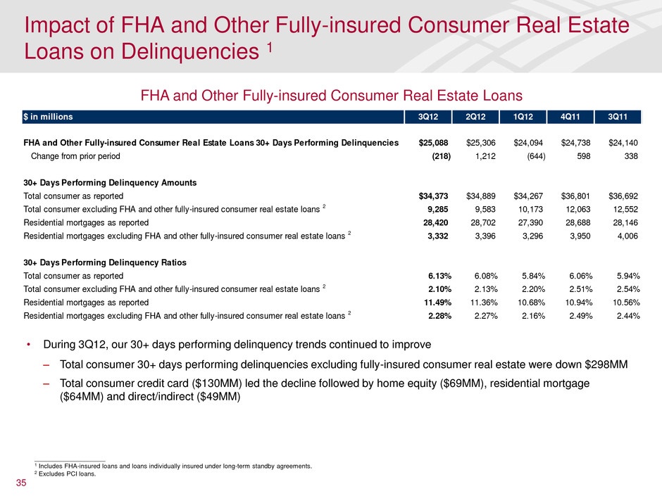 34 ____________________ 1 Excludes FHA-insured loans and other loans individually insured under long-term standby agreements. 2 Excludes PCI loans. 3 During 3Q12, we reclassified to nonperforming $83MM of residential mortgages that were 30+ days performing past due as a result of the change in treatment of loans discharged in Chapter 7 bankruptcy. 4 During 1Q12, we reclassified to nonperforming $264MM of junior-lien loans that were previously 30+ days performing past due but had a first-lien loan that was more than 90 days past due, in accordance with regulatory interagency guidance. Residential Mortgage, 30+ Days Performing Past Due ($B) 1, 2 Home Equity, 30+ Days Performing Past Due ($B) 2 Residential Mortgage and Home Equity 30+ Days Performing Delinquencies $5.7 $7.0 $5.3 $4.0 $4.0 $3.3 $3.4 $3.3 2.3% 3.1% 2.8% 2.4% 2.5% 2.2% 2.3% 2.3% 0.0% 0.5% 1.0% 1.5% 2.0% 2.5% 3.0% 3.5% $2.5 $3.5 $4.5 $5.5 $6.5 $7.5 $8.5 3Q08 3Q09 3Q10 3Q11 4Q11 1Q12 2Q12 3Q12 30+ days past due 30+ days past due % $1.9 $2.2 $2.0 $1.7 $1.7 $1.3 $1.2 $1.1 1.4% 1.6% 1.6% 1.5% 1.5% 1.2% 1.1% 1.1% 0.0% 0.5% 1.0% 1.5% 2.0% $1.0 $1.5 $2.0 $2.5 $3.0 3Q08 3Q09 3Q10 3Q11 4Q11 1Q12 2Q12 3Q12 30+ days past due 30+ days past due % 4 3