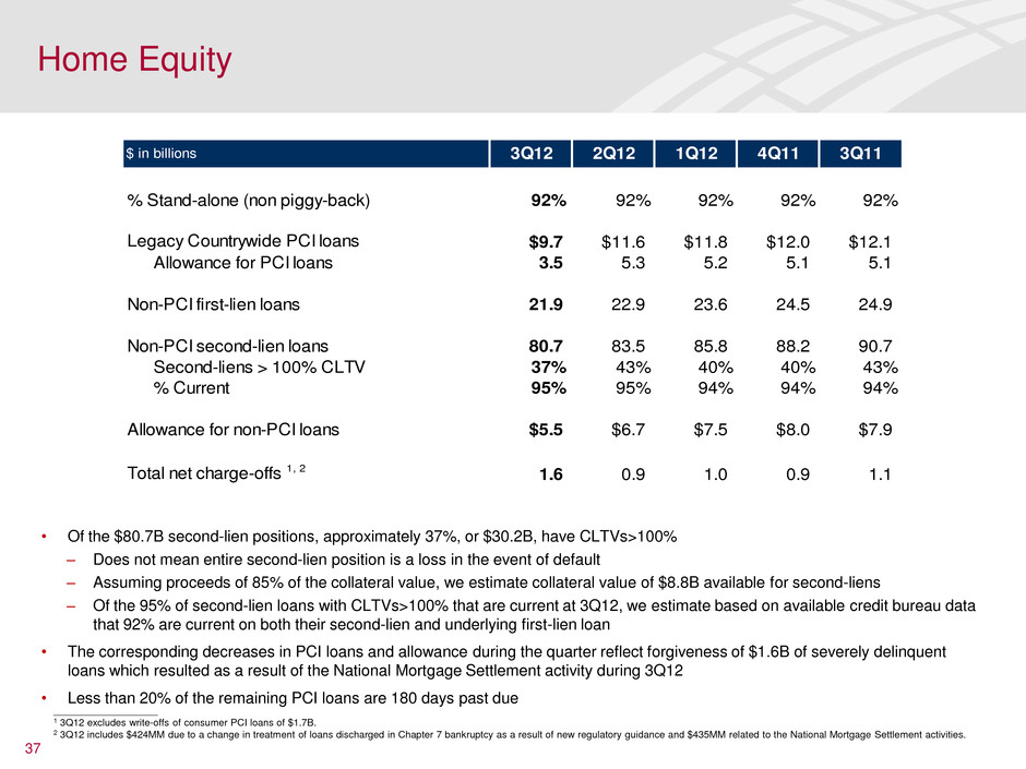 36 ____________________ 1 Excludes FVO loans. 2 Loan-to-value (LTV) calculations apply to the residential mortgage portfolio. Combined loan-to-value (CLTV) calculations apply to the home equity portfolio. Home Loans Asset Quality Key Indicators As Reported Excluding Countrywide Purchased Credit- impaired and Fully- insured Loans As Reported Excluding Countrywide Purchased Credit- impaired and Fully- insured Loans As Reported Excluding Countrywide Purchased Credit- impaired As Reported Excluding Countrywide Purchased Credit- impaired Loans end of period $247,340 $146,367 $252,635 $149,322 $112,260 $102,551 $118,011 $106,372 Loans average 250,336 149,588 255,172 152,167 116,184 105,246 119,657 107,954 Net charge-offs $707 $707 $734 $734 $1,621 $1,621 $892 $892 % of average loans 1.12% 1.88% 1.16% 1.94% 5.55% 6.13% 3.00% 3.32% Allowance for loan losses $5,576 $3,960 $5,899 $4,306 $8,949 $5,454 $11,994 $6,659 % of loans 2.25% 2.71% 2.33% 2.88% 7.97% 5.32% 10.16% 6.26% Average refreshed (C)LTV 2 81 83 84 88 90%+ refreshed (C)LTV 2 34% 36% 42% 46% Average refreshed FICO 722 719 743 743 % below 620 FICO 14% 15% 8% 9% $ in millions Residential Mortgage 1 Home Equity 3Q12 2Q12 3Q12 2Q12