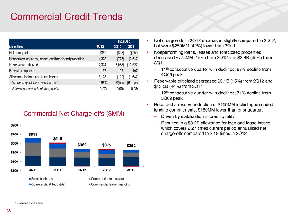 • Net charge-offs in 3Q12 decreased slightly compared to 2Q12, but were $259MM (42%) lower than 3Q11 • Nonperforming loans, leases and foreclosed properties decreased $775MM (15%) from 2Q12 and $3.6B (45%) from 3Q11 – 11th consecutive quarter with declines; 68% decline from 4Q09 peak • Reservable criticized decreased $3.1B (15%) from 2Q12 and $13.5B (44%) from 3Q11 – 12th consecutive quarter with declines; 71% decline from 3Q09 peak • Recorded a reserve reduction of $155MM including unfunded lending commitments, $180MM lower than prior quarter. – Driven by stabilization in credit quality – Resulted in a $3.2B allowance for loan and lease losses which covers 2.27 times current period annualized net charge-offs compared to 2.18 times in 2Q12 38 ____________________ 1 Excludes FVO loans. Commercial Credit Trends $ in millions 2Q12 3Q11 Net charge-offs $352 ($23) ($259) Nonperforming loans, leases and foreclosed properties 4,373 (775) (3,647) Reservable criticiz d 17,374 (3,068) (13,527) Provision expens 197 157 197 Allowance for loan and lease losses 3,178 (122) (1,647) % coverage of lo ns and leases 1 0.98% (9)bps (61)bps # times annualized net charge-offs 2.27x 0.09x 0.28x 3Q12 Inc/(Dec) Commercial Net Charge-offs ($MM) $611 $516 $369 $375 $352 -$100 $100 $300 $500 $700 $900 3Q11 4Q11 1Q12 2Q12 3Q12 Small business Commercial real estate Commercial & Industrial Commercial lease financing
