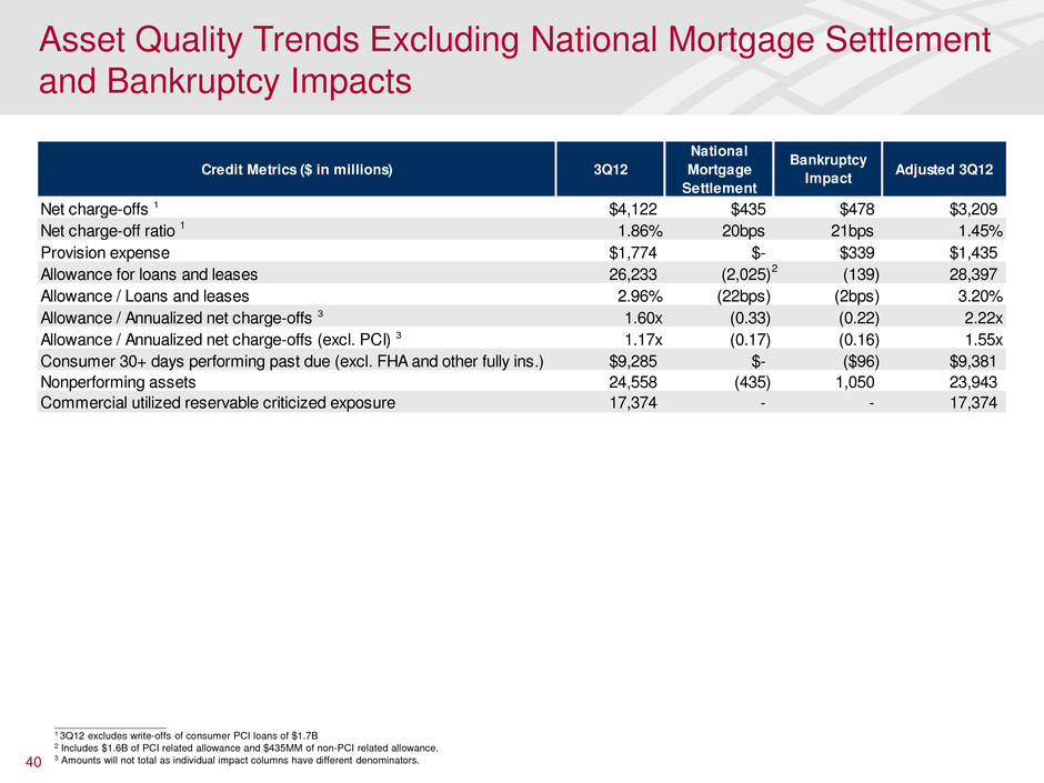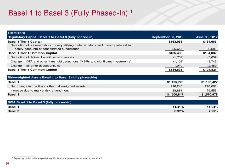 Basel 1 to Basel 3 (Fully Phased-In) 1 39 $ in millions Regulatory Capital Basel 1 to Basel 3 (fully phased-in) Basel 1 Tier 1 Capital $163,063 $164,665 Deduction of preferred stock, non-qualifying preferred stock and minority interest in equity accounts of consolidated subsidiaries (26,657) (30,583) Basel 1 Tier 1 Common Capital $136,406 $134,082 Deduction of defined benefit pension assets (1,709) (3,057) Change in DTA and other threshold deductions (MSRs and significant investments) (1,102) (3,745) Change in all other deductions, net 1,040 (2,459) Basel 3 Tier 1 Common Capital $134,635 $124,821 Risk-weighted Assets Basel 1 to Basel 3 (fully phased-in) Basel 1 $1,195,720 $1,193,422 Net change in credit and other risk-weighted assets 216,246 298,003 Increase due to market risk amendment 88,881 79,553 Basel 3 $1,500,847 $1,570,978 RWA Basel 1 to Basel 3 (fully phased-in) Basel 1 11.41% 11.24% Basel 3 8.97% 7.95% September 30, 2012 June 30, 2012 ____________________ 1 Regulatory capital ratios are preliminary. For important presentation information, see slide 3.