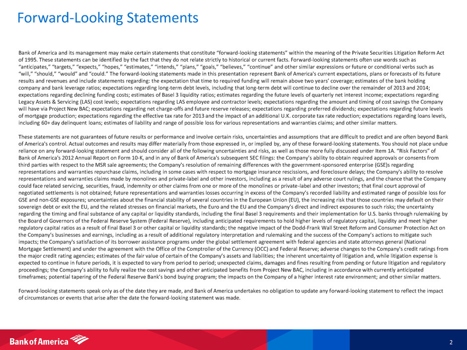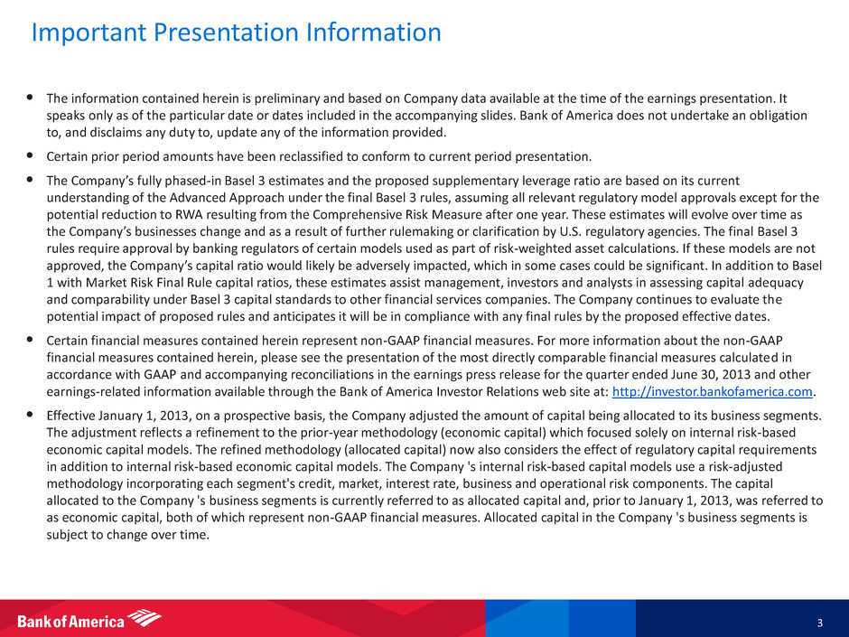 Forward-Looking Statements 2 Bank of America and its management may make certain statements that constitute “forward-looking statements” within the meaning of the Private Securities Litigation Reform Act of 1995. These statements can be identified by the fact that they do not relate strictly to historical or current facts. Forward-looking statements often use words such as “anticipates,” “targets,” “expects,” “hopes,” “estimates,” “intends,” “plans,” “goals,” “believes,” “continue” and other similar expressions or future or conditional verbs such as “will,” “should,” “would” and “could.” The forward-looking statements made in this presentation represent Bank of America's current expectations, plans or forecasts of its future results and revenues and include statements regarding: the expectation that time to required funding will remain above two years’ coverage; estimates of the bank holding company and bank leverage ratios; expectations regarding long-term debt levels, including that long-term debt will continue to decline over the remainder of 2013 and 2014; expectations regarding declining funding costs; estimates of Basel 3 liquidity ratios; estimates regarding the future levels of quarterly net interest income; expectations regarding Legacy Assets & Servicing (LAS) cost levels; expectations regarding LAS employee and contractor levels; expectations regarding the amount and timing of cost savings the Company will have via Project New BAC; expectations regarding net charge-offs and future reserve releases; expectations regarding preferred dividends; expectations regarding future levels of mortgage production; expectations regarding the effective tax rate for 2013 and the impact of an additional U.K. corporate tax rate reduction; expectations regarding loans levels, including 60+ day delinquent loans; estimates of liability and range of possible loss for various representations and warranties claims; and other similar matters. These statements are not guarantees of future results or performance and involve certain risks, uncertainties and assumptions that are difficult to predict and are often beyond Bank of America's control. Actual outcomes and results may differ materially from those expressed in, or implied by, any of these forward-looking statements. You should not place undue reliance on any forward-looking statement and should consider all of the following uncertainties and risks, as well as those more fully discussed under Item 1A. “Risk Factors” of Bank of America's 2012 Annual Report on Form 10-K, and in any of Bank of America's subsequent SEC filings: the Company’s ability to obtain required approvals or consents from third parties with respect to the MSR sale agreements; the Company's resolution of remaining differences with the government-sponsored enterprise (GSE)s regarding representations and warranties repurchase claims, including in some cases with respect to mortgage insurance rescissions, and foreclosure delays; the Company's ability to resolve representations and warranties claims made by monolines and private-label and other investors, including as a result of any adverse court rulings, and the chance that the Company could face related servicing, securities, fraud, indemnity or other claims from one or more of the monolines or private-label and other investors; that final court approval of negotiated settlements is not obtained; future representations and warranties losses occurring in excess of the Company’s recorded liability and estimated range of possible loss for GSE and non-GSE exposures; uncertainties about the financial stability of several countries in the European Union (EU), the increasing risk that those countries may default on their sovereign debt or exit the EU, and the related stresses on financial markets, the Euro and the EU and the Company’s direct and indirect exposures to such risks; the uncertainty regarding the timing and final substance of any capital or liquidity standards, including the final Basel 3 requirements and their implementation for U.S. banks through rulemaking by the Board of Governors of the Federal Reserve System (Federal Reserve), including anticipated requirements to hold higher levels of regulatory capital, liquidity and meet higher regulatory capital ratios as a result of final Basel 3 or other capital or liquidity standards; the negative impact of the Dodd-Frank Wall Street Reform and Consumer Protection Act on the Company’s businesses and earnings, including as a result of additional regulatory interpretation and rulemaking and the success of the Company’s actions to mitigate such impacts; the Company's satisfaction of its borrower assistance programs under the global settlement agreement with federal agencies and state attorneys general (National Mortgage Settlement) and under the agreement with the Office of the Comptroller of the Currency (OCC) and Federal Reserve; adverse changes to the Company's credit ratings from the major credit rating agencies; estimates of the fair value of certain of the Company’s assets and liabilities; the inherent uncertainty of litigation and, while litigation expense is expected to continue in future periods, it is expected to vary from period to period; unexpected claims, damages and fines resulting from pending or future litigation and regulatory proceedings; the Company’s ability to fully realize the cost savings and other anticipated benefits from Project New BAC, including in accordance with currently anticipated timeframes; potential tapering of the Federal Reserve Bank’s bond buying program; the impacts on the Company of a higher interest rate environment; and other similar matters. Forward-looking statements speak only as of the date they are made, and Bank of America undertakes no obligation to update any forward-looking statement to reflect the impact of circumstances or events that arise after t