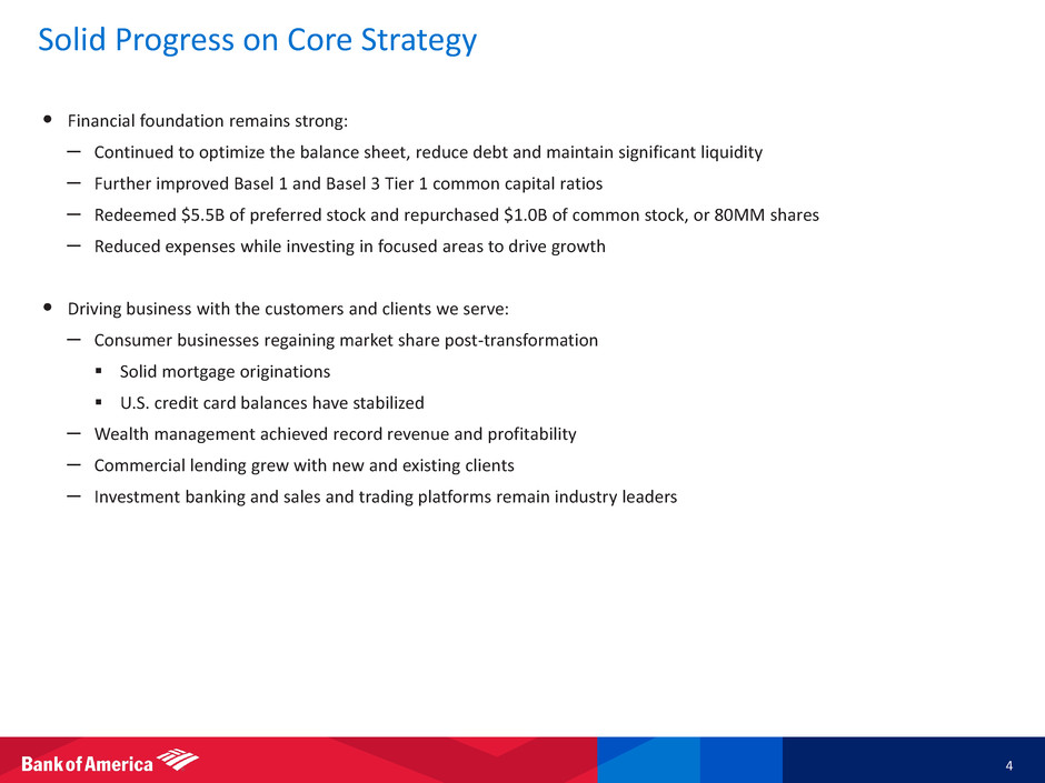 • The information contained herein is preliminary and based on Company data available at the time of the earnings presentation. It speaks only as of the particular date or dates included in the accompanying slides. Bank of America does not undertake an obligation to, and disclaims any duty to, update any of the information provided. • Certain prior period amounts have been reclassified to conform to current period presentation. • The Company’s fully phased-in Basel 3 estimates and the proposed supplementary leverage ratio are based on its current understanding of the Advanced Approach under the final Basel 3 rules, assuming all relevant regulatory model approvals except for the potential reduction to RWA resulting from the Comprehensive Risk Measure after one year. These estimates will evolve over time as the Company’s businesses change and as a result of further rulemaking or clarification by U.S. regulatory agencies. The final Basel 3 rules require approval by banking regulators of certain models used as part of risk-weighted asset calculations. If these models are not approved, the Company’s capital ratio would likely be adversely impacted, which in some cases could be significant. In addition to Basel 1 with Market Risk Final Rule capital ratios, these estimates assist management, investors and analysts in assessing capital adequacy and comparability under Basel 3 capital standards to other financial services companies. The Company continues to evaluate the potential impact of proposed rules and anticipates it will be in compliance with any final rules by the proposed effective dates. • Certain financial measures contained herein represent non-GAAP financial measures. For more information about the non-GAAP financial measures contained herein, please see the presentation of the most directly comparable financial measures calculated in accordance with GAAP and accompanying reconciliations in the earnings press release for the quarter ended June 30, 2013 and other earnings-related information available through the Bank of America Investor Relations web site at: http://investor.bankofamerica.com. • Effective January 1, 2013, on a prospective basis, the Company adjusted the amount of capital being allocated to its business segments. The adjustment reflects a refinement to the prior-year methodology (economic capital) which focused solely on internal risk-based economic capital models. The refined methodology (allocated capital) now also considers the effect of regulatory capital requirements in addition to internal risk-based economic capital models. The Company 's internal risk-based capital models use a risk-adjusted methodology incorporating each segment's credit, market, interest rate, business and operational risk components. The capital allocated to the Company 's business segments is currently referred to as allocated capital and, prior to January 1, 2013, was referred to as economic capital, both of which represent non-GAAP financial measures. Allocated capital in the Company 's business segments is subject to change over time. Important Presentation Information 3