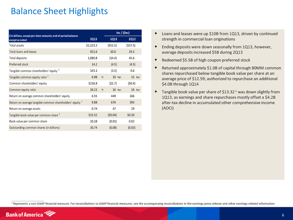 2Q13 Results 5 ____________________ 1 Amounts may not total due to rounding. 2 Fully taxable-equivalent (FTE) basis. Represents a non-GAAP financial measure. 3 Represents a non-GAAP financial measure. On a GAAP basis, net interest income; total revenue, net of interest expense; and income tax expense were $10.5B, $22.7B and $1.5B for 2Q13, respectively. For reconciliations of these measures to GAAP financial measures, see the accompanying reconciliations in the earnings press release and other earnings-related information. Net interest income 2, 3 $10.8 Noninterest income 12.2 Total revenue, net of interest expense 2, 3 22.9 Noninterest expense 16.0 Pre-tax, pre-provision earnings 2 6.9 Provision for credit losses 1.2 Income before income taxes 5.7 Income tax expense 2, 3 1.7 Net income $4.0 Diluted earnings per share $0.32 Average diluted common shares (in billions) 11.5 Summary Income Statement ($B except EPS) 1
