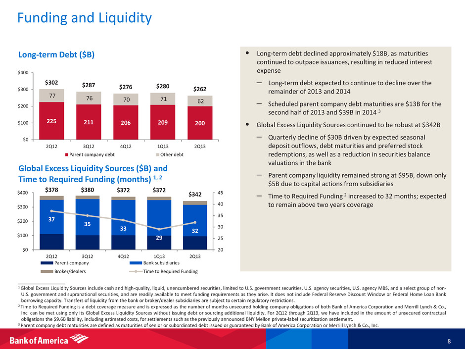 Basel 1 1 • Continued to grow Tier 1 common capital ratio to 10.83%, up 34bps from 1Q13 and 45bps from pro-forma 4Q12 Basel 3 3 • Estimated Tier 1 common capital ratio of 9.60%, up 8bps from 1Q13 • $43B RWA reduction driven by overall improvement in credit quality Proposed Supplementary Leverage Ratio 4 • In connection with the July 2013 proposed U.S. NPR, we estimate our bank holding company supplementary leverage ratio to be approximately 4.9% - 5.0% at 2Q13 Regulatory Capital 7 ____________________ 1 As of January 1, 2013, the Market Risk Final Rule became effective under Basel 1. The Market Risk Final Rule introduces new measures of market risk including a charge related to stressed Value-at-Risk (sVaR), an incremental risk charge and a comprehensive risk measure, as well as other technical modifications. Regulatory capital ratios are preliminary until filed with the Federal Reserve on Form Y-9C. 2 Pro-forma 4Q12 Tier 1 common capital includes the estimated impact of the Market Risk Final Rule, an increase of approximately $78.8B of risk-weighted assets, as of 4Q12. Represents a non-GAAP financial measure. 3 Based on the Advanced Approach under the final Basel 3 rules issued on July 2, 2013. Represents a non-GAAP financial measure. For important presentation information, see slide 3 and reconciliations on slide 23. 4 The supplementary leverage ratio is calculated in accordance with the final Basel 3 rules and represents an average of the monthly ratios for the quarter of Tier 1 capital to the sum of on-balance sheet assets and off-balance sheet exposures, including, among other items, derivative and securities financing transactions. 9.52% 9.60% 0.30% 0.29% (0.32%) (0.19%) 8.0% 8.5% 9.0% 9.5% 10.0% 10.5% 1Q13 RWA reduction Net income (excl. FVO/DVA) AOCI impact All other 2Q13 Basel 3 Tier 1 Common Ratio 3 $ in billions 4Q12 Pro-forma 4Q12 1, 2 1Q13 2Q13 Basel 1 1 Tier 1 common capital $133.4 $133.4 $136.1 $139.5 Risk-weighted assets 1,206.0 1,284.8 1,298.2 1,288.2 Tier 1 common ratio 11.06% 10.38% 10.49% 10.83% Basel 3 (fully phased-in) 3 Tier 1 common capital $128.6 $128.8 $125.8 Risk-weighted assets 1,390.9 1,353.6 1,310.4 Tier 1 common ratio 9.25% 9.52% 9.60%