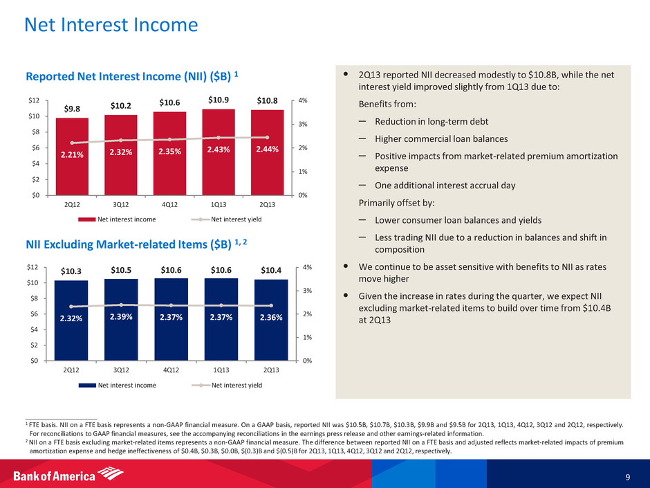 Funding and Liquidity 8 $378 $380 $372 $372 $342 37 35 33 29 32 20 25 30 35 40 45 $0 $100 $200 $300 $400 2Q12 3Q12 4Q12 1Q13 2Q13 Parent company Bank subsidiaries Broker/dealers Time to Required Funding 225 211 206 209 200 77 76 70 71 62 $302 $287 $276 $280 $262 $0 $100 $200 $300 $400 2Q12 3Q12 4Q12 1Q13 2Q13 Parent company debt Other debt Global Excess Liquidity Sources ($B) and Time to Required Funding (months) 1, 2 • Long-term debt declined approximately $18B, as maturities continued to outpace issuances, resulting in reduced interest expense – Long-term debt expected to continue to decline over the remainder of 2013 and 2014 – Scheduled parent company debt maturities are $13B for the second half of 2013 and $39B in 2014 3 • Global Excess Liquidity Sources continued to be robust at $342B – Quarterly decline of $30B driven by expected seasonal deposit outflows, debt maturities and preferred stock redemptions, as well as a reduction in securities balance valuations in the bank – Parent company liquidity remained strong at $95B, down only $5B due to capital actions from subsidiaries – Time to Required Funding 2 increased to 32 months; expected to remain above two years coverage 1 Global Excess Liquidity Sources include cash and high-quality, liquid, unencumbered securities, limited to U.S. government securities, U.S. agency securities, U.S. agency MBS, and a select group of non- U.S. government and supranational securities, and are readily available to meet funding requirements as they arise. It does not include Federal Reserve Discount Window or Federal Home Loan Bank borrowing capacity. Transfers of liquidity from the bank or broker/dealer subsidiaries are subject to certain regulatory restrictions. 2 Time to Required Funding is a debt coverage measure and is expressed as the number of months unsecured holding company obligations of both Bank of America Corporation and Merrill Lynch & Co., Inc. can be met using only its Global Excess Liquidity Sources without issuing debt or sourcing additional liquidity. For 2Q12 through 2Q13, we have included in the amount of unsecured contractual obligations the $9.6B liability, including estimated costs, for settlements such as the previously announced BNY Mellon private-label securitization settlement. 3 Parent company debt maturities are defined as maturities of senior or subordinated debt issued or guaranteed by Bank of America Corporation or Merrill Lynch & Co., Inc. Long-term Debt ($B)