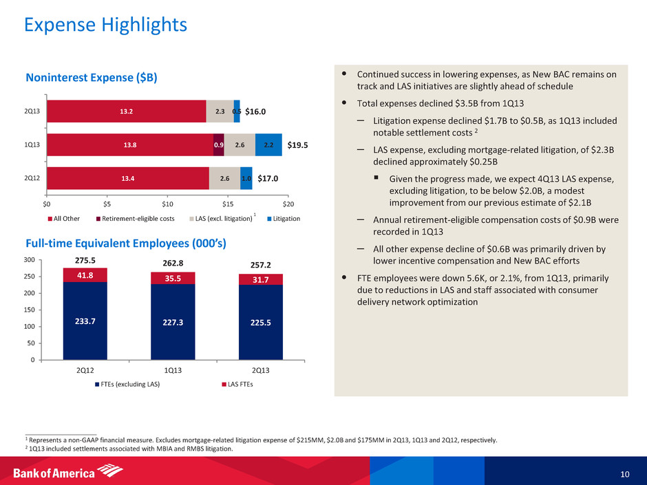 Net Interest Income 9 • 2Q13 reported NII decreased modestly to $10.8B, while the net interest yield improved slightly from 1Q13 due to: Benefits from: – Reduction in long-term debt – Higher commercial loan balances – Positive impacts from market-related premium amortization expense – One additional interest accrual day Primarily offset by: – Lower consumer loan balances and yields – Less trading NII due to a reduction in balances and shift in composition • We continue to be asset sensitive with benefits to NII as rates move higher • Given the increase in rates during the quarter, we expect NII excluding market-related items to build over time from $10.4B at 2Q13 ____________________ 1 FTE basis. NII on a FTE basis represents a non-GAAP financial measure. On a GAAP basis, reported NII was $10.5B, $10.7B, $10.3B, $9.9B and $9.5B for 2Q13, 1Q13, 4Q12, 3Q12 and 2Q12, respectively. For reconciliations to GAAP financial measures, see the accompanying reconciliations in the earnings press release and other earnings-related information. 2 NII on a FTE basis excluding market-related items represents a non-GAAP financial measure. The difference between reported NII on a FTE basis and adjusted reflects market-related impacts of premium amortization expense and hedge ineffectiveness of $0.4B, $0.3B, $0.0B, $(0.3)B and $(0.5)B for 2Q13, 1Q13, 4Q12, 3Q12 and 2Q12, respectively. $9.8 $10.2 $10.6 $10.9 $10.8 2.21% 2.32% 2.35% 2.43% 2.44% 0% 1% 2% 3% 4% $0 $2 $4 $6 $8 $10 $12 2Q12 3Q12 4Q12 1Q13 2Q13 Net interest income Net interest yield $10.3 $10.5 $10.6 $10.6 $10.4 2.32% 2.39% 2.37% 2.37% 2.36% 0% 1% 2% 3% 4% $0 $2 $4 $6 $8 $10 $12 2Q12 3Q12 4Q12 1Q13 2Q13 Net interest income Net interest yield Reported Net Interest Income (NII) ($B) 1 NII Excluding Market-related Items ($B) 1, 2