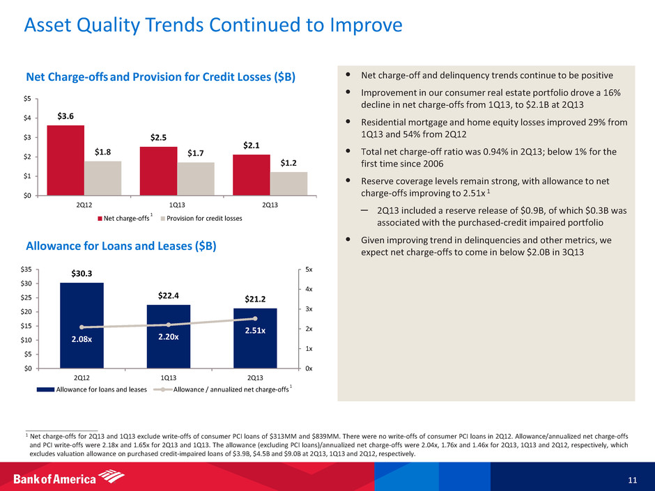 13.4 13.8 13.2 0.9 2.6 2.6 2.3 1.0 2.2 0.5 $17.0 $19.5 $16.0 $0 $5 $10 $15 $20 2Q12 1Q13 2Q13 All Other Retirement-eligible costs LAS (excl. litigation) Litigation Expense Highlights ____________________ 1 Represents a non-GAAP financial measure. Excludes mortgage-related litigation expense of $215MM, $2.0B and $175MM in 2Q13, 1Q13 and 2Q12, respectively. 2 1Q13 included settlements associated with MBIA and RMBS litigation. • Continued success in lowering expenses, as New BAC remains on track and LAS initiatives are slightly ahead of schedule • Total expenses declined $3.5B from 1Q13 – Litigation expense declined $1.7B to $0.5B, as 1Q13 included notable settlement costs 2 – LAS expense, excluding mortgage-related litigation, of $2.3B declined approximately $0.25B Given the progress made, we expect 4Q13 LAS expense, excluding litigation, to be below $2.0B, a modest improvement from our previous estimate of $2.1B – Annual retirement-eligible compensation costs of $0.9B were recorded in 1Q13 – All other expense decline of $0.6B was primarily driven by lower incentive compensation and New BAC efforts • FTE employees were down 5.6K, or 2.1%, from 1Q13, primarily due to reductions in LAS and staff associated with consumer delivery network optimization Noninterest Expense ($B) Full-time Equivalent Employees (000’s) 10 1 233.7 227.3 225.5 41.8 35.5 31.7 275.5 262.8 257.2 0 50 100 150 200 250 300 2Q12 1Q13 2Q13 FTEs (excluding LAS) LAS FTEs
