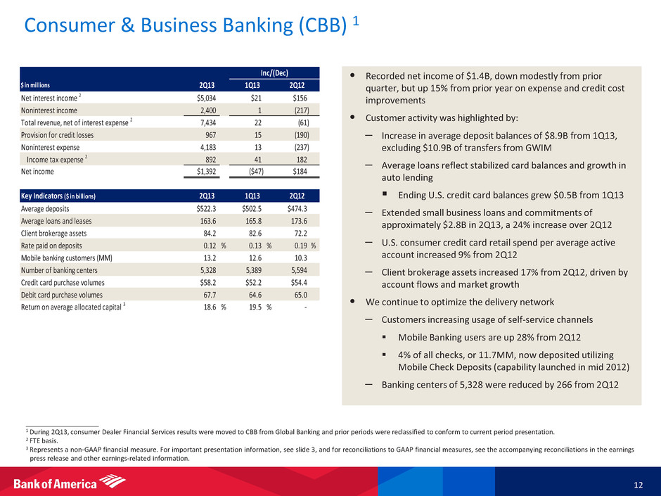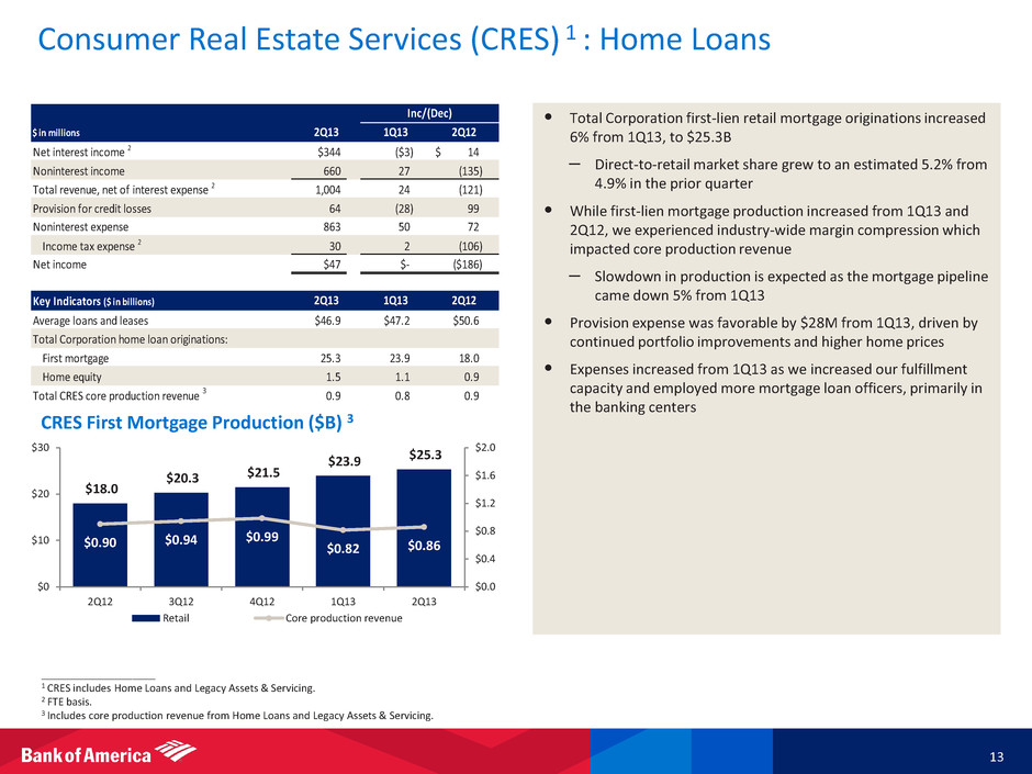 Consumer & Business Banking (CBB) 1 12 ____________________ 1 During 2Q13, consumer Dealer Financial Services results were moved to CBB from Global Banking and prior periods were reclassified to conform to current period presentation. 2 FTE basis. 3 Represents a non-GAAP financial measure. For important presentation information, see slide 3, and for reconciliations to GAAP financial measures, see the accompanying reconciliations in the earnings press release and other earnings-related information. • [ Bullets to come ] $ in millions Net interest income 2 $5,034 $21 $156 Noninterest income 2,400 1 (217) Total revenue, net of interest expense 2 7,434 22 (61) Provision for credit losses 967 15 (190) Noninterest expense 4,183 13 (237) Income tax expense 2 892 41 182 Net income $1,392 ($47) $184 Key Indicators ($ in billions) Average deposits $522.3 $502.5 $474.3 Average loans and leases 163.6 165.8 173.6 Client brokerage assets 84.2 82.6 72.2 Rate paid on deposits 0.12 % 0.13 % 0.19 % Mobile banking custo ers (MM) 13.2 12.6 10.3 Number of banking centers 5,328 5,389 5,594 Credit card purchase volumes $58.2 $52.2 $54.4 Debit card purchase volumes 67.7 64.6 65.0 Return on average allocated capital 3 18.6 % 19.5 % - Inc/(Dec) 2Q121Q132Q13 1Q13 2Q122Q13 • Recorded net income of $1.4B, down modestly from prior quarter, but up 15% from prior year on expense and credit cost improvements • Customer activity was highlighted by: – Increase in average deposit balances of $8.9B from 1Q13, excluding $10.9B of transfers from GWIM – Average loans reflect stabilized card balances and growth in auto lending Ending U.S. credit card balances grew $0.5B from 1Q13 – Extended small business loans and commitments of approximately $2.8B in 2Q13, a 24% increase over 2Q12 – U.S. consumer credit card retail spend per average active account increased 9% from 2Q12 – Client brokerage assets increased 17% from 2Q12, driven by account flows and market growth • We continue to optimize the delivery network – Customers increasing usage of self-service channels Mobile Banking users are up 28% from 2Q12 4% of all checks, or 11.7MM, now deposited utilizing Mobile Check Deposits (capability launched in mid 2012) – Banking centers of 5,328 were reduced by 266 from 2Q12