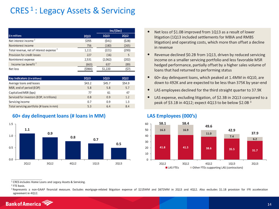 $ in millions Net interest income 2 $344 ($3) 14$ Noninterest income 660 27 (135) Total revenue, net of interest expense 2 1,004 24 (121) Provision for credit losses 64 (28) 99 Noninterest expense 863 50 72 Income tax expense 2 30 2 (106) Net income $47 $- ($186) Key Indicators ($ in billions) Average loans and leases $46.9 $47.2 $50.6 Total Corporation home loan originations: First mortgage 25.3 23.9 18.0 Home equity 1.5 1.1 0.9 Total CRES core production revenue 3 0.9 0.8 0.9 1Q13 2Q12 Inc/(Dec) 2Q13 1Q13 2Q12 2Q13 Consumer Real Estate Services (CRES) 1 : Home Loans 13 • Total Corporation first-lien retail mortgage originations increased 6% from 1Q13, to $25.3B – Direct-to-retail market share grew to an estimated 5.2% from 4.9% in the prior quarter • While first-lien mortgage production increased from 1Q13 and 2Q12, we experienced industry-wide margin compression which impacted core production revenue – Slowdown in production is expected as the mortgage pipeline came down 5% from 1Q13 • Provision expense was favorable by $28M from 1Q13, driven by continued portfolio improvements and higher home prices • Expenses increased from 1Q13 as we increased our fulfillment capacity and employed more mortgage loan officers, primarily in the banking centers ____________________ 1 CRES includes Home Loans and Legacy Assets & Servicing. 2 FTE basis. 3 Includes core production revenue from Home Loans and Legacy Assets & Servicing. $18.0 $20.3 $21.5 $23.9 $25.3 $0.90 $0.94 $0.99 $0.82 $0.86 $0.0 $0.4 $0.8 $1.2 $1.6 $2.0 $0 $10 $20 $30 2Q12 3Q12 4Q12 1Q13 2Q13 Th o u sa n d s Retail Core production revenue CRES First Mortgage Production ($B) 3