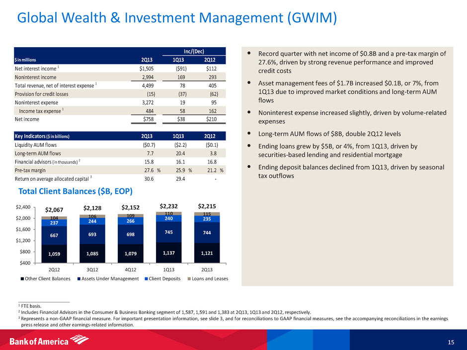 $ in millions Net interest income 2 $355 ($41) ($28) Noninterest income 756 (180) (265) Total revenue, net of interest expense 2 1,111 (221) (293) Provision for credit losses 227 (16) 5 Noninterest expense 2,531 (2,062) (202) Income tax benefit 2 (663) 637 (89) Net loss ($984) $1,220 ($7) Key Indicators ($ in billions) Average loans and leases $43.2 $45.7 $54.9 MSR, end of period (EOP) 5.8 5.8 5.7 Capitalized MSR (bps) 77 61 47 Serviced for investors (EOP, in trillions) 0.8 0.9 1.2 Servicing income 0.7 0.9 1.3 Total servicing portfolio (# loans in mm) 5.3 6.4 8.4 2Q13 1Q13 2Q12 Inc/(Dec) 2Q13 1Q13 2Q12 CRES 1 : Legacy Assets & Servicing 14 • Net loss of $1.0B improved from 1Q13 as a result of lower litigation (1Q13 included settlements for MBIA and RMBS litigation) and operating costs, which more than offset a decline in revenue • Revenue declined $0.2B from 1Q13, driven by reduced servicing income on a smaller servicing portfolio and less favorable MSR hedged performance, partially offset by a higher sales volume of loans that had returned to performing status • 60+ day delinquent loans, which peaked at 1.4MM in 4Q10, are down to 492K and are expected to be less than 375K by year-end • LAS employees declined for the third straight quarter to 37.9K • LAS expense, excluding litigation, of $2.3B in 2Q13 compared to a peak of $3.1B in 4Q12; expect 4Q13 to be below $2.0B 3 ____________________ 1 CRES includes Home Loans and Legacy Assets & Servicing. 2 FTE basis. 3 Represents a non-GAAP financial measure. Excludes mortgage-related litigation expense of $215MM and $672MM in 2Q13 and 4Q12. Also excludes $1.1B provision for IFR acceleration agreement in 4Q12. 1.1 0.9 0.8 0.7 0.5 0.0 0.5 1.0 1.5 2Q12 3Q12 4Q12 1Q13 2Q13 60+ day delinquent loans (# loans in MM) 41.8 41.5 38.6 35.5 31.7 16.3 16.9 11.0 7.4 6.2 58.1 58.4 49.6 42.9 37.9 0 10 20 30 40 50 60 2Q12 3Q12 4Q12 1Q13 2Q13 LAS FTEs Other FTEs supporting LAS (contractors) LAS Employees (000’s)
