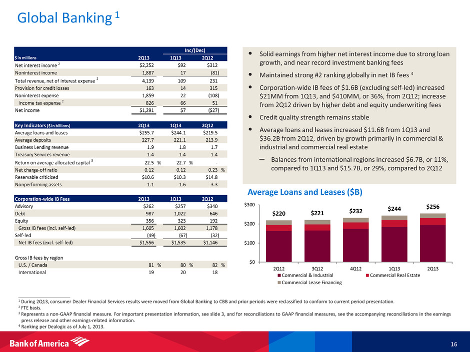 Global Wealth & Investment Management (GWIM) 15 ____________________ 1 FTE basis. 2 Includes Financial Advisors in the Consumer & Business Banking segment of 1,587, 1,591 and 1,383 at 2Q13, 1Q13 and 2Q12, respectively. 3 Represents a non-GAAP financial measure. For important presentation information, see slide 3, and for reconciliations to GAAP financial measures, see the accompanying reconciliations in the earnings press release and other earnings-related information. $ in millions Net interest income 1 $1,505 ($91) $112 Noninterest income 2,994 169 293 Total revenue, net of interest expense 1 4,499 78 405 Provision for credit losses (15) (37) (62) Noninterest expense 3,272 19 95 Income tax expense 1 484 58 162 Net income $758 $38 $210 Key Indicators ($ in billions) Liquidity AUM flows ($0.7) ($2.2) ($0.1) Long-term AUM flows 7.7 20.4 3.8 Financial advisors (in thousands) 2 15.8 16.1 16.8 Pre-tax margin 27.6 % 25.9 % 21.2 % Return on average allocated capital 3 30.6 29.4 - Inc/(Dec) 2Q13 2Q13 1Q13 2Q12 1Q13 2Q12 1,059 1,085 1,079 1,137 1,121 667 693 698 745 744 237 244 266 240 235 104 106 109 110 115 $2,067 $2,128 $2,152 $2,232 $2,215 $400 $800 $1,200 $1,600 $2,000 $2,400 2Q12 3Q12 4Q12 1Q13 2Q13 Other Client Balances Assets Under Management Client Deposits Loans and Leases Total Client Balances ($B, EOP) • Record quarter with net income of $0.8B and a pre-tax margin of 27.6%, driven by strong revenue performance and improved credit costs • Asset management fees of $1.7B increased $0.1B, or 7%, from 1Q13 due to improved market conditions and long-term AUM flows • Noninterest expense increased slightly, driven by volume-related expenses • Long-term AUM flows of $8B, double 2Q12 levels • Ending loans grew by $5B, or 4%, from 1Q13, driven by securities-based lending and residential mortgage • Ending deposit balances declined from 1Q13, driven by seasonal tax outflows