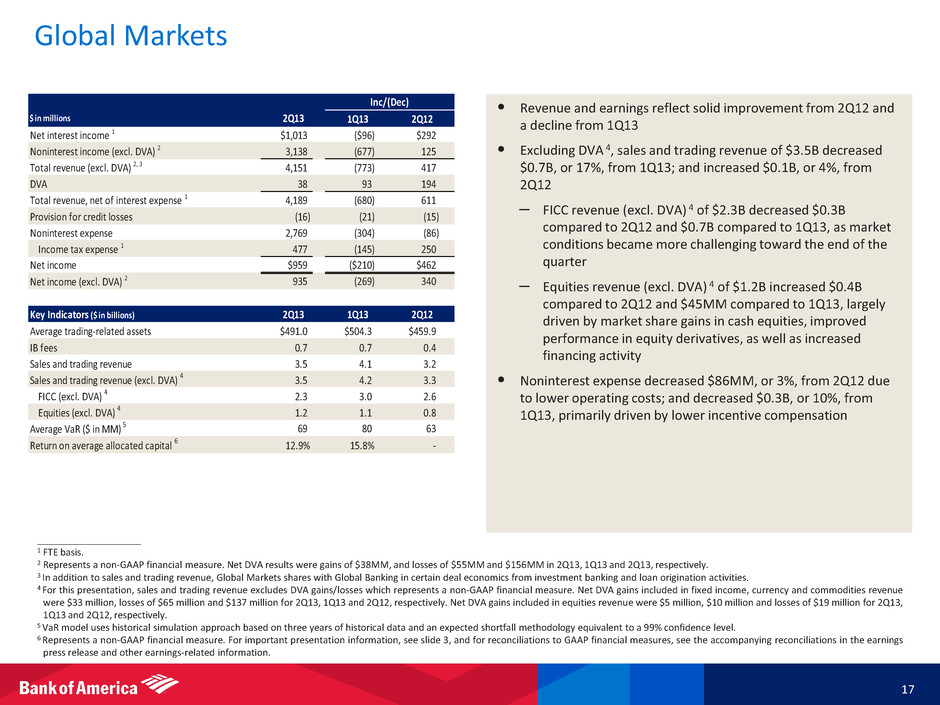 Global Banking 1 16 ____________________ 1 During 2Q13, consumer Dealer Financial Services results were moved from Global Banking to CBB and prior periods were reclassified to conform to current period presentation. 2 FTE basis. 3 Represents a non-GAAP financial measure. For important presentation information, see slide 3, and for reconciliations to GAAP financial measures, see the accompanying reconciliations in the earnings press release and other earnings-related information. 4 Ranking per Dealogic as of July 1, 2013. • [ Bullets to come ] • Solid earnings from higher net interest income due to strong loan growth, and near record investment banking fees • Maintained strong #2 ranking globally in net IB fees 4 • Corporation-wide IB fees of $1.6B (excluding self-led) increased $21MM from 1Q13, and $410MM, or 36%, from 2Q12; increase from 2Q12 driven by higher debt and equity underwriting fees • Credit quality strength remains stable • Average loans and leases increased $11.6B from 1Q13 and $36.2B from 2Q12, driven by growth primarily in commercial & industrial and commercial real estate – Balances from international regions increased $6.7B, or 11%, compared to 1Q13 and $15.7B, or 29%, compared to 2Q12 $220 $221 $232 $244 $256 $0 $100 $200 $300 2Q12 3Q12 4Q12 1Q13 2Q13 Commercial & Industrial Commercial Real Estate Commercial Lease Financing Average Loans and Leases ($B) $ in millions 2Q13 1Q13 2Q12 Net interest income 2 $2,252 $92 $312 Noninterest income 1,887 17 (81) Total revenue, net of interest expense 2 4,139 109 231 Provision for credit losses 163 14 315 Noninterest expense 1,859 22 (108) Income tax expense 2 826 66 51 Net income $1,291 $7 ($27) Key Indicators ($ in billions) 2Q13 1Q13 2Q12 Average loans and leases $255.7 $244.1 $219.5 Average deposits 227.7 221.1 213.9 Business Lending revenue 1.9 1.8 1.7 Treasury Services revenue 1.4 1.4 1.4 Return on average allocated capital 3 22.5 % 22.7 % - Net charge-off ratio 0.12 0.12 0.23 % Reservable criticized $10.6 $10.3 $14.8 Nonperforming assets 1.1 1.6 3.3 Corporation-wide IB Fees 2Q13 1Q13 2Q12 Advisory $262 $257 $340 Debt 987 1,022 646 Equity 356 323 192 Gross IB fees (incl. self-led) 1,605 1,602 1,178 Self-led (49) (67) (32) Net IB fees (excl. self-led) $1,556 $1,535 $1,146 Gross IB fees by region U.S. / Canada 81 % 80 % 82 % International 19 20 18 Inc/(Dec)