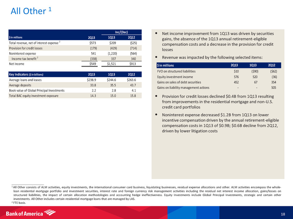 • Net income of $864MM increased $2.4B from 3Q12 driven by the tax benefit from recognition of foreign tax credits, and $0.8B lower negative FVO adjustments on structured liabilities related to improvements in our own credit spreads • Results were impacted by the following selected items ____________________ 1 All Other consists of ALM activities, equity investments, the international consumer card business, liquidating businesses, residual expense allocations and other. ALM activities encompass the whole- loan residential mortgage portfolio and investment securities, interest rate and foreign currency risk management activities including the residual net interest income allocation, gains/losses on structured liabilities, the impact of certain allocation methodologies and accounting hedge ineffectiveness. Equity Investments include Global Principal Investments, strategic and certain other investments. All Other includes certain residential mortgage loans that are managed by LAS. 2 FTE basis. $ in millions Total revenue, net of interest expense 2 $573 $209 ($25) Provision for credit losses (179) (429) (714) Noninterest expense 541 (1,220) (564) Income tax benefit 2 (338) 337 340 Net income $549 $1,521 $913 Key Indicators ($ in billions) Average loans and l ases $238.9 $244.6 $263.6 Average deposits 33.8 35.5 43.7 Book value of Global Principal Investments 2.2 2.8 4.1 Total BAC equity investment exposure 14.3 15.0 15.8 2Q13 1Q13 2Q12 2Q13 1Q13 2Q12 Inc/(Dec) $ in milli ns 4Q12 3Q12 4Q11 FVO on structured liabilities ($442) ($1,289) ($814) Equity investment income 570 172 3,136 Gains on sales of debt securities 116 328 1,101 Payment protecti n insurance provision 3 (225) (267) - (110) (25) 1,200 Gains (losses) on debt repurchases and exchanges of trust preferred securities 18 • Net income improvement from 1Q13 was driven by securities gains, the absence of the 1Q13 annual retirement-eligible compensation costs and a decrease in the provision for credit losses • Revenue was impacted by the following selected items: • Provision for credit losses declined $0.4B from 1Q13 resulting from improvements in the residential mortgage and non-U.S. credit card portfolios • Noninterest expense decreased $1.2B from 1Q13 on lower incentive compensation driven by the annual retirement-eligible compensation costs in 1Q13 of $0.9B; $0.6B decline from 2Q12, driven by lower litigation costs All Other 1 $ in illions FVO on structured liabilities $10 ($90) ($62) Equity investment income 576 520 (36) G ins o sales of debt securities 452 67 354 - - 505 Gains on liability management actions 2Q13 Q13 2Q12