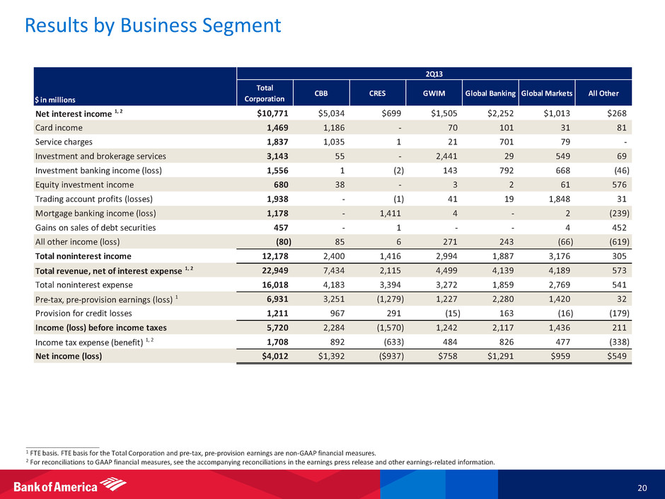 ____________________ 1 FTE basis. FTE basis for the Total Corporation and pre-tax, pre-provision earnings are non-GAAP financial measures. 2 For reconciliations to GAAP financial measures, see the accompanying reconciliations in the earnings press release and other earnings-related information. Results by Business Segment 20 $ in millions Total Corporation CBB CRES GWIM Global Banking Global Markets All Other Net interest income 1, 2 $10,771 $5,034 $699 $1,505 $2,252 $1,013 $268 Card income 1,469 1,186 - 70 101 31 81 Service charges 1,837 1,035 1 21 701 79 - Investment and brokerage services 3,143 55 - 2,441 29 549 69 Investment banking income (loss) 1,556 1 (2) 143 792 668 (46) Equity investment income 680 38 - 3 2 61 576 Trading account profits (losses) 1,938 - (1) 41 19 1,848 31 Mortgage banking income (loss) 1,178 - 1,411 4 - 2 (239) Gains on sales of debt securities 457 - 1 - - 4 452 All other income (loss) (80) 85 6 271 243 (66) (619) Total noninterest income 12,178 2,400 1,416 2,994 1,887 3,176 305 Total revenue, net of interest expense 1, 2 22,949 7,434 2,115 4,499 4,139 4,189 573 Total noninterest expense 16,018 4,183 3,394 3,272 1,859 2,769 541 Pre-tax, pre-provision earnings (loss) 1 6,931 3,251 (1,279) 1,227 2,280 1,420 32 Provision for credit losses 1,211 967 291 (15) 163 (16) (179) Income (loss) before income taxes 5,720 2,284 (1,570) 1,242 2,117 1,436 211 Income tax expense (benefit) 1, 2 1,708 892 (633) 484 826 477 (338) Net income (loss) $4,012 $1,392 ($937) $758 $1,291 $959 $549 2Q13