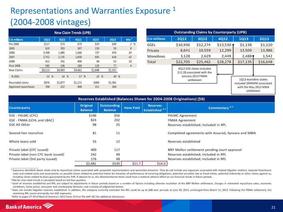 Representations and Warranties Exposure 1 (2004-2008 vintages) 21 ____________________ 1 Exposures identified above relate only to repurchase claims associated with purported representations and warranties breaches. They do not include any exposures associated with related litigation matters; separate foreclosure costs and related costs and assessments; or possible losses related to potential claims for breaches of performance of servicing obligations, potential securities law or fraud claims, potential indemnity or other claims against us, including claims related to loans guaranteed by the FHA. If adverse to us, the aforementioned items could have a material adverse effect on our financial results in future periods. 2 Mix for new claim trends is calculated based on last four quarters. 3 Level of reserves established and RPL are subject to adjustments in future periods based on a number of factors including ultimate resolution of the BNY Mellon settlement, changes in estimated repurchase rates, economic conditions, home prices, consumer and counterparty behavior, and a variety of judgmental factors. 4 Does not include litigation reserves established. In addition, the company currently estimates the RPL could be up to $4B over accruals at June 30, 2013, unchanged from March 31, 2013. Following the FNMA settlement, the remaining RPL covers principally non-GSE exposures. 5 Refer to pages 57-59 of Bank of America’s 2012 Form 10-K on file with SEC for additional disclosures. $ in millions 2Q12 3Q12 4Q12 1Q13 2Q13 GSEs $10,936 $12,274 $13,530 $1,138 $1,120 Private 8,641 10,559 12,299 13,509 13,986 Monolines 3,128 2,629 2,449 2,488 1,542 Total $22,705 $25,462 $28,278 $17,135 $16,648 Outstanding Claims by Counterparty (UPB) $ in millions Pre 2005 $117 $73 $79 $29 $49 2 % 2005 619 393 307 220 59 8 2006 3,768 1,485 1,566 737 476 34 2007 2,752 2,135 1,830 693 618 42 2008 412 701 490 40 52 10 Post 2008 545 196 189 129 77 4 New Claims $8,213 $4,983 $4,461 $ ,848 $1,331 % GSEs 53 % 54 % 57 % 22 % 40 % Rescinded claims $876 $1,877 $1,131 $409 $1,381 Approved repurchases 704 322 468 311 364 New Claim Trends (UPB) Mix 2 1Q13 2Q133Q122Q12 4Q12 Counterparty Original Balance Outstanding Balance Have Paid Reserves Established 3, 4 Commentary 3, 5 GSE - FHLMC (CFC) $196 $56 FHLMC Agreement GSE - FNMA (LCHL and LBAC) 824 202 FNMA Agreement GSE All Other 98 25 Reserves established; Included in RPL Second-lie monoline 81 11 Completed agreements with Assured, Syncora and MBIA Whole l ans sold 55 12 Reserves established Private label (CFC issued) 409 117 BNY Mellon settlement pending court approval Private label (non CFC bank issued) 242 49 Reserves established; Included in RPL Private label (3rd party issued) 176 48 Reserves established; Included in RPL $2,081 $520 $21.7 $14.0 Reserves Established (Balances Shown for 2004-2008 Originations) ($B) 4Q12 GSE claims included $12.2B associated with the January 2013 FNMA settlement 1Q13 monoline claims included $945MM associated with the May 2013 MBIA settlement