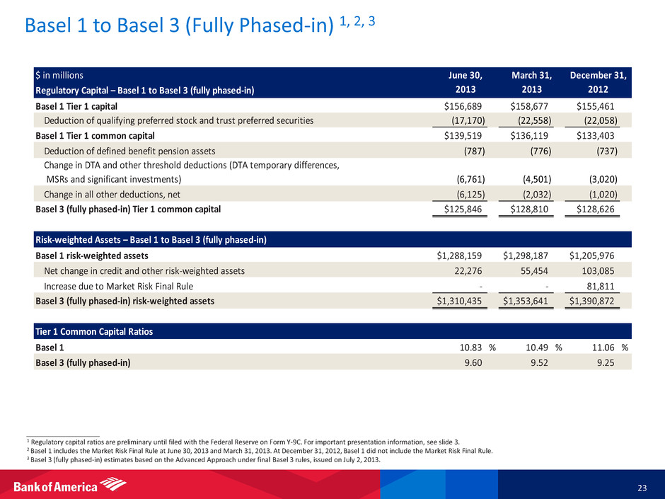 Basel 1 to Basel 3 (Fully Phased-in) 1, 2, 3 23 ____________________ 1 Regulatory capital ratios are preliminary until filed with the Federal Reserve on Form Y-9C. For important presentation information, see slide 3. 2 Basel 1 includes the Market Risk Final Rule at June 30, 2013 and March 31, 2013. At December 31, 2012, Basel 1 did not include the Market Risk Final Rule. 3 Basel 3 (fully phased-in) estimates based on the Advanced Approach under final Basel 3 rules, issued on July 2, 2013. $ in millions Regulatory Capital – Basel 1 to Basel 3 (fully phased-in) Basel 1 Tier 1 capital $156,689 $158,677 $155,461 Deduction of qualifying preferred stock and trust preferred securities (17,170) (22,558) (22,058) Basel 1 Tier 1 common capital $139,519 $136,119 $133,403 Deduction of defined benefit pension assets (787) (776) (737) Change in DTA and other threshold deductions (DTA temporary differences, MSRs and significant investments) (6,761) (4,501) (3,020) Change in all other deductions, net (6,125) (2,032) (1,020) Basel 3 (fully phased-in) Tier 1 common capital $125,846 $128,810 $128,626 Risk-weighted Assets – Basel 1 to Basel 3 (fully phased-in) Basel 1 risk-weighted assets $1,288,159 $1,298,187 $1,205,976 Net change in credit and other risk-weighted assets 22,276 55,454 103,085 Increase due to Market Risk Final Rule - - 81,811 Basel 3 (fully phased-in) risk-weighted assets $1,310,435 $1,353,641 $1,390,872 Tier 1 Common Capital Ratios Basel 1 10.83 % 10.49 % 11.06 % Basel 3 (fully phased-in) 9.60 9.52 9.25 December 31, 2012 March 31, 2013 June 30, 2013