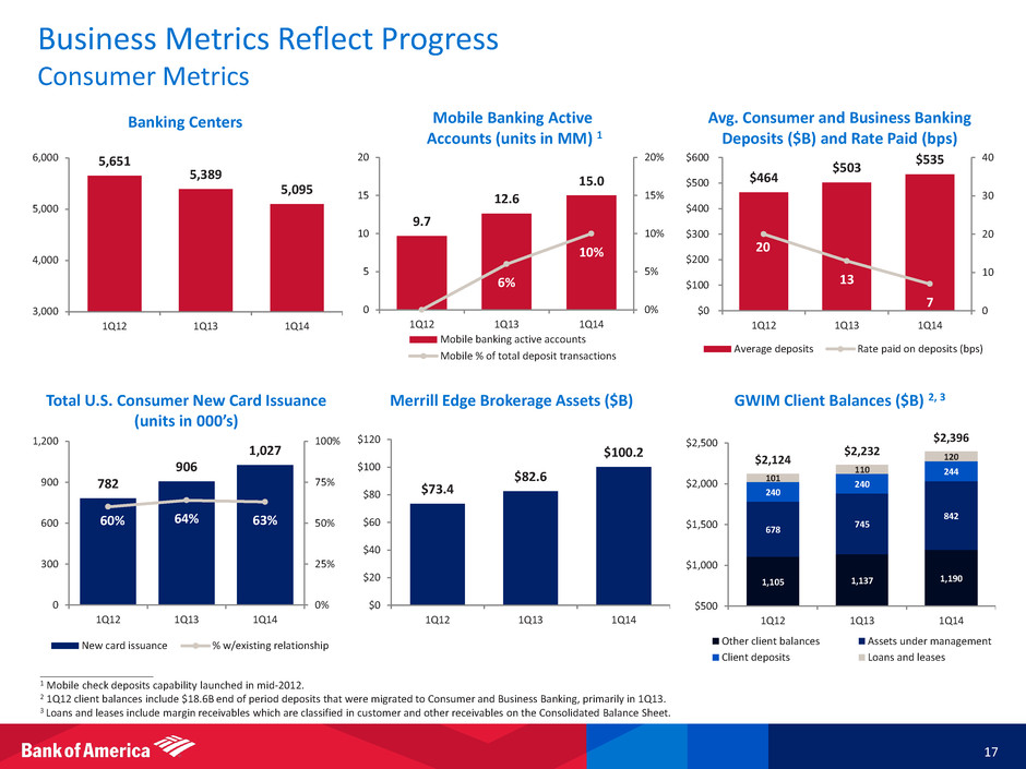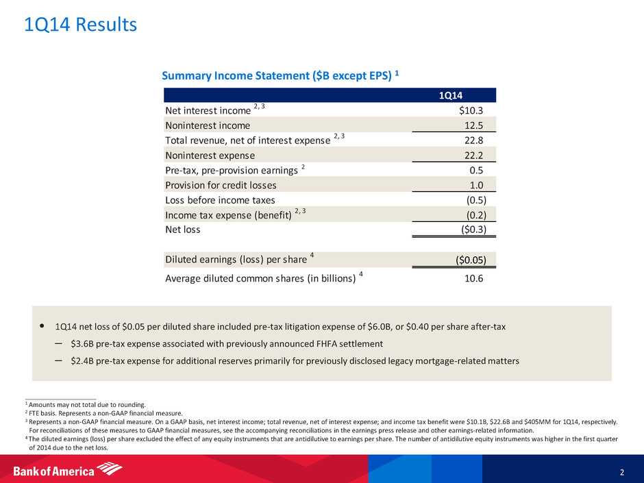 ____________________ 1 FTE basis. FTE basis for the Total Corporation and pre-tax, pre-provision earnings are non-GAAP financial measures. 2 For reconciliations to GAAP financial measures, see the accompanying reconciliations in the earnings press release and other earnings-related information. Results by Business Segment $ in millions Total Corporation CBB CRES GWIM Global Banking Global Markets All Other Net interest income 1, 2 $10,286 $4,951 $701 $1,485 $2,301 $1,000 ($152) Card income 1,393 1,162 - 53 83 9 86 Service charges 1,826 1,045 - 20 687 73 1 Investment and brokerage services 3,269 61 - 2,604 25 561 18 Investment banking income (loss) 1,542 1 - 66 822 736 (83) Equity investment income 784 24 - 2 55 29 674 Trading account profits 2,467 - 2 47 44 2,367 7 Mortgage banking income (loss) 412 - 469 - - 1 (58) Gains on sales of debt securities 377 - 10 - - 10 357 All other income (loss) 411 194 10 270 252 229 (544) Total noninterest income 12,481 2,487 491 3,062 1,968 4,015 458 Total revenue, net of interest expense 1, 2 22,767 7,438 1,192 4,547 4,269 5,015 306 Total noninterest expense 22,238 3,975 8,129 3,359 2,028 3,078 1,669 Pre-tax, pre-provision earnings (loss) 1 529 3,463 (6,937) 1,188 2,241 1,937 (1,363) Provision for credit losses 1,009 812 25 23 265 19 (135) Income (loss) before income taxes (480) 2,651 (6,962) 1,165 1,976 1,918 (1,228) Income tax expense (benefit) 1, 2 (204) 993 (1,935) 436 740 608 (1,046) Net income (loss) ($276) $1,658 ($5,027) $729 $1,236 $1,310 ($182) 1Q14 16