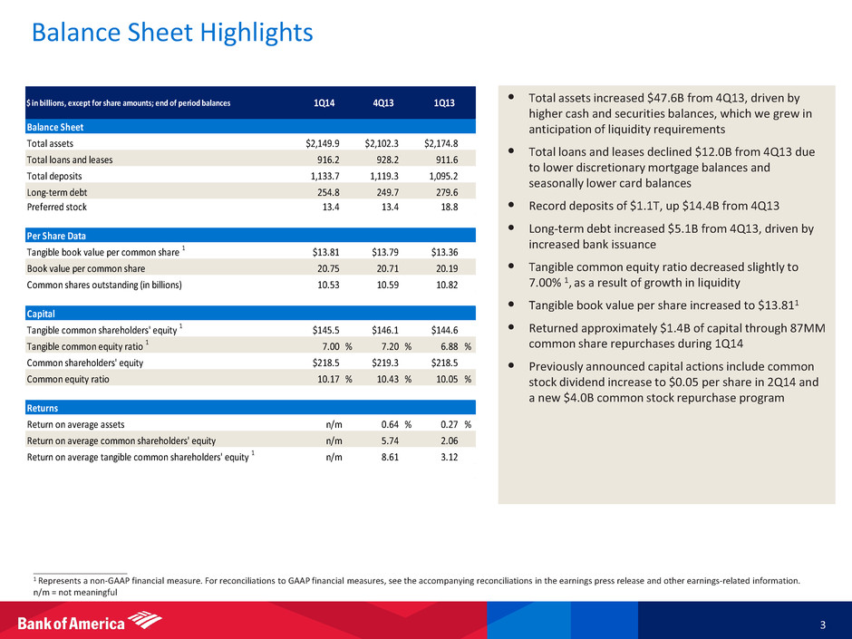 1Q14 Results 2 ____________________ 1 Amounts may not total due to rounding. 2 FTE basis. Represents a non-GAAP financial measure. 3 Represents a non-GAAP financial measure. On a GAAP basis, net interest income; total revenue, net of interest expense; and income tax benefit were $10.1B, $22.6B and $405MM for 1Q14, respectively. For reconciliations of these measures to GAAP financial measures, see the accompanying reconciliations in the earnings press release and other earnings-related information. 4 The diluted earnings (loss) per share excluded the effect of any equity instruments that are antidilutive to earnings per share. The number of antidilutive equity instruments was higher in the first quarter of 2014 due to the net loss. 1Q14 Net interest income 2, 3 $10.3 Noninterest income 12.5 Total revenue, net of interest expense 2, 3 22.8 Noninterest expense 22.2 Pre-tax, pre-provision earnings 2 0.5 Provision for credit losses 1.0 Loss before income taxes (0.5) Income tax expense (benefit) 2, 3 (0.2) Net loss ($0.3) Diluted earnings (loss) per share 4 ($0.05) Average diluted common shares (in billions) 4 10.6 Summary Income Statement ($B except EPS) 1 • 1Q14 net loss of $0.05 per diluted share included pre-tax litigation expense of $6.0B, or $0.40 per share after-tax – $3.6B pre-tax expense associated with previously announced FHFA settlement – $2.4B pre-tax expense for additional reserves primarily for previously disclosed legacy mortgage-related matters