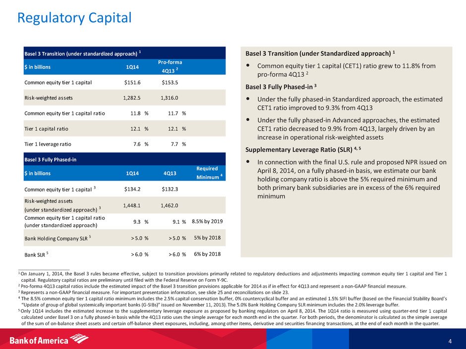 ____________________ 1 Represents a non-GAAP financial measure. For reconciliations to GAAP financial measures, see the accompanying reconciliations in the earnings press release and other earnings-related information. n/m = not meaningful Balance Sheet Highlights 3 • Total assets increased $47.6B from 4Q13, driven by higher cash and securities balances, which we grew in anticipation of liquidity requirements • Total loans and leases declined $12.0B from 4Q13 due to lower discretionary mortgage balances and seasonally lower card balances • Record deposits of $1.1T, up $14.4B from 4Q13 • Long-term debt increased $5.1B from 4Q13, driven by increased bank issuance • Tangible common equity ratio decreased slightly to 7.00% 1, as a result of growth in liquidity • Tangible book value per share increased to $13.811 • Returned approximately $1.4B of capital through 87MM common share repurchases during 1Q14 • Previously announced capital actions include common stock dividend increase to $0.05 per share in 2Q14 and a new $4.0B common stock repurchase program $ in billions, except for share amounts; end of period balances Balance Sheet Total assets $2,149.9 $2,102.3 $2,174.8 Total loans and leases 916.2 928.2 911.6 Total deposits 1,133.7 1,119.3 1,095.2 Long-term debt 254.8 249.7 279.6 Preferred stock 13.4 13.4 18.8 Per Share Data Tangible book value per common share 1 $13.81 $13.79 $13.36 Book value per common share 20.75 20.71 20.19 Common shares outstanding (in billions) 10.53 10.59 10.82 Capital Tangible common shareholders' equity 1 $145.5 $146.1 $144.6 Tangible common equity ratio 1 7.00 % 7.20 % 6.88 % Common shareholders' equity $218.5 $219.3 $218.5 Common equity ratio 10.17 % 10.43 % 10.05 % Returns Return on average assets n/m 0.64 % 0.27 % Return on average common shareholders' equity n/m 5.74 2.06 Return on average t gible common shareholders' equity 1 n/m 8.61 3.12 1Q14 4Q13 1Q13
