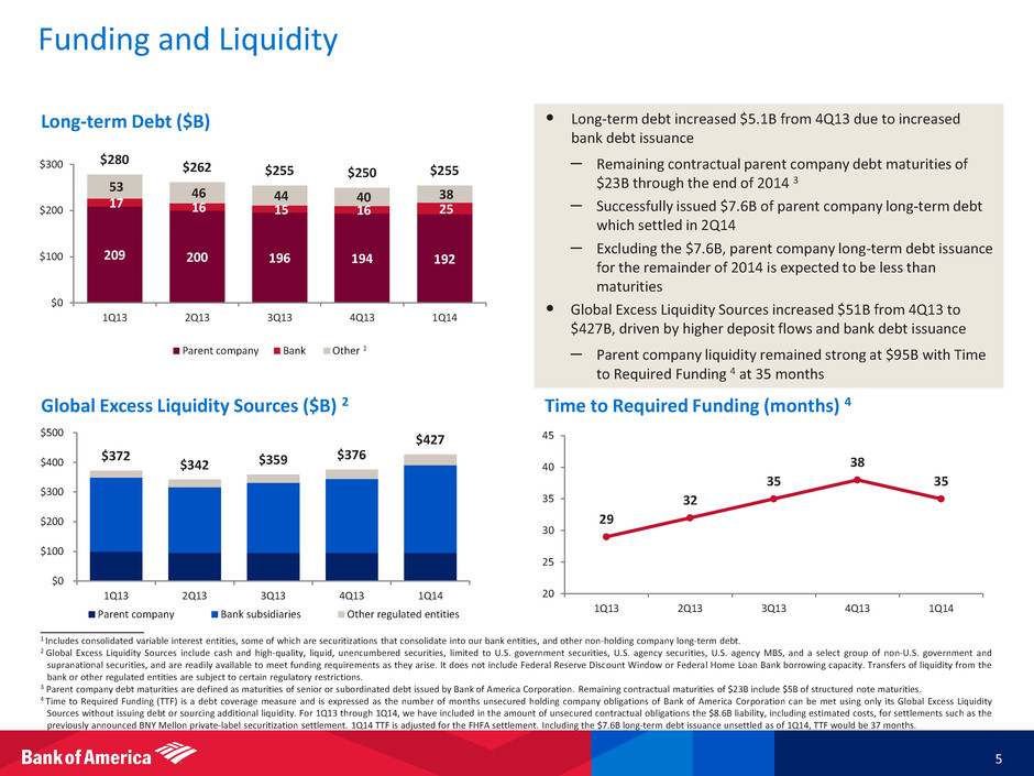 Basel 3 Transition (under Standardized approach) 1 • Common equity tier 1 capital (CET1) ratio grew to 11.8% from pro-forma 4Q13 2 Basel 3 Fully Phased-in 3 • Under the fully phased-in Standardized approach, the estimated CET1 ratio improved to 9.3% from 4Q13 • Under the fully phased-in Advanced approaches, the estimated CET1 ratio decreased to 9.9% from 4Q13, largely driven by an increase in operational risk-weighted assets Supplementary Leverage Ratio (SLR) 4, 5 • In connection with the final U.S. rule and proposed NPR issued on April 8, 2014, on a fully phased-in basis, we estimate our bank holding company ratio is above the 5% required minimum and both primary bank subsidiaries are in excess of the 6% required minimum Regulatory Capital 4 ____________________ 1 On January 1, 2014, the Basel 3 rules became effective, subject to transition provisions primarily related to regulatory deductions and adjustments impacting common equity tier 1 capital and Tier 1 capital. Regulatory capital ratios are preliminary until filed with the Federal Reserve on Form Y-9C. 2 Pro-forma 4Q13 capital ratios include the estimated impact of the Basel 3 transition provisions applicable for 2014 as if in effect for 4Q13 and represent a non-GAAP financial measure. 3 Represents a non-GAAP financial measure. For important presentation information, see slide 25 and reconciliations on slide 23. 4 The 8.5% common equity tier 1 capital ratio minimum includes the 2.5% capital conservation buffer, 0% countercyclical buffer and an estimated 1.5% SIFI buffer (based on the Financial Stability Board’s “Update of group of global systemically important banks (G-SIBs)” issued on November 11, 2013). The 5.0% Bank Holding Company SLR minimum includes the 2.0% leverage buffer. 5 Only 1Q14 includes the estimated increase to the supplementary leverage exposure as proposed by banking regulators on April 8, 2014. The 1Q14 ratio is measured using quarter-end tier 1 capital calculated under Basel 3 on a fully phased-in basis while the 4Q13 ratio uses the simple average for each month end in the quarter. For both periods, the denominator is calculated as the simple average of the sum of on-balance sheet assets and certain off-balance sheet exposures, including, among other items, derivative and securities financing transactions, at the end of each month in the quarter. Basel 3 Transition (under standardized approach) 1 $ in billions Common equity tier 1 capital $151.6 $153.5 Risk-weighted assets 1,282.5 1,316.0 Common equity tier 1 capital ratio 11.8 % 11.7 % Tier 1 capital ratio 12.1 % 12.1 % Tier 1 leverage ratio 7.6 % 7.7 % Basel 3 Fully Phased-in $ in billions Common equity tier 1 capital 3 $134.2 $132.3 Risk-weighted assets (under standardized approach) 3 1,448.1 1,462.0 Common equity tier 1 capital ratio (under standardized approach) 9.3 % 9.1 % Bank Holding Company SLR 5 > 5.0 % > 5.0 % Bank SLR 5 > 6.0 % > 6.0 % 8.5% by 2019 5% by 2018 6% by 2018 1Q14 Pro-forma 4Q13 2 1Q14 4Q13 Required Minimum 4
