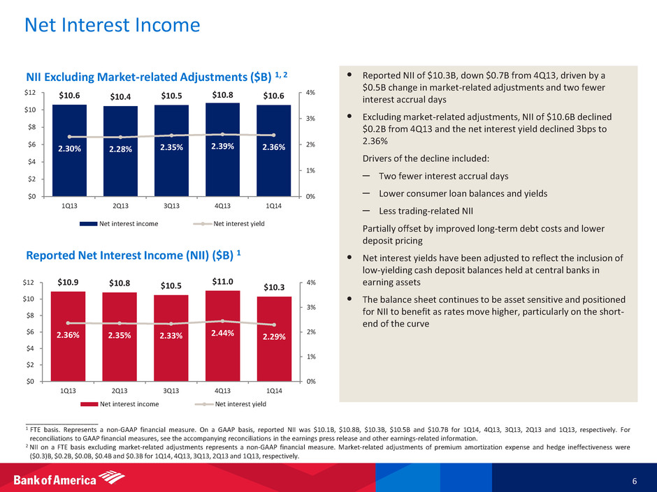Funding and Liquidity 5 Global Excess Liquidity Sources ($B) 2 • Long-term debt increased $5.1B from 4Q13 due to increased bank debt issuance – Remaining contractual parent company debt maturities of $23B through the end of 2014 3 – Successfully issued $7.6B of parent company long-term debt which settled in 2Q14 – Excluding the $7.6B, parent company long-term debt issuance for the remainder of 2014 is expected to be less than maturities • Global Excess Liquidity Sources increased $51B from 4Q13 to $427B, driven by higher deposit flows and bank debt issuance – Parent company liquidity remained strong at $95B with Time to Required Funding 4 at 35 months 1 Includes consolidated variable interest entities, some of which are securitizations that consolidate into our bank entities, and other non-holding company long-term debt. 2 Global Excess Liquidity Sources include cash and high-quality, liquid, unencumbered securities, limited to U.S. government securities, U.S. agency securities, U.S. agency MBS, and a select group of non-U.S. government and supranational securities, and are readily available to meet funding requirements as they arise. It does not include Federal Reserve Discount Window or Federal Home Loan Bank borrowing capacity. Transfers of liquidity from the bank or other regulated entities are subject to certain regulatory restrictions. 3 Parent company debt maturities are defined as maturities of senior or subordinated debt issued by Bank of America Corporation. Remaining contractual maturities of $23B include $5B of structured note maturities. 4 Time to Required Funding (TTF) is a debt coverage measure and is expressed as the number of months unsecured holding company obligations of Bank of America Corporation can be met using only its Global Excess Liquidity Sources without issuing debt or sourcing additional liquidity. For 1Q13 through 1Q14, we have included in the amount of unsecured contractual obligations the $8.6B liability, including estimated costs, for settlements such as the previously announced BNY Mellon private-label securitization settlement. 1Q14 TTF is adjusted for the FHFA settlement. Including the $7.6B long-term debt issuance unsettled as of 1Q14, TTF would be 37 months. Long-term Debt ($B) Time to Required Funding (months) 4 $372 $342 $359 $376 $427 $0 $100 $200 $300 $400 $500 1Q13 2Q13 3Q13 4Q13 1Q14 Parent company Bank subsidiaries Other regulated entities 209 200 196 194 192 17 16 15 16 25 53 46 44 40 38 $280 $262 $255 $250 $255 $0 $100 $200 $300 1Q13 2Q13 3Q13 4Q13 1Q14 Parent company Bank Other 29 32 35 38 35 20 25 30 35 40 45 1Q13 2Q13 3Q13 4Q13 1Q14 1