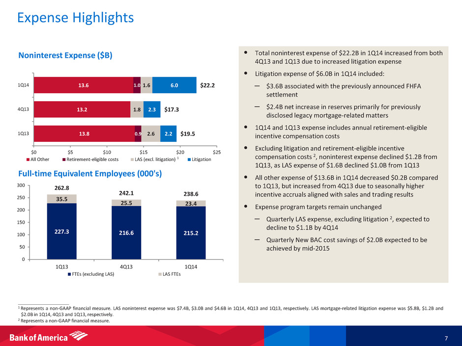 Net Interest Income 6 • Reported NII of $10.3B, down $0.7B from 4Q13, driven by a $0.5B change in market-related adjustments and two fewer interest accrual days • Excluding market-related adjustments, NII of $10.6B declined $0.2B from 4Q13 and the net interest yield declined 3bps to 2.36% Drivers of the decline included: – Two fewer interest accrual days – Lower consumer loan balances and yields – Less trading-related NII Partially offset by improved long-term debt costs and lower deposit pricing • Net interest yields have been adjusted to reflect the inclusion of low-yielding cash deposit balances held at central banks in earning assets • The balance sheet continues to be asset sensitive and positioned for NII to benefit as rates move higher, particularly on the short- end of the curve ____________________ 1 FTE basis. Represents a non-GAAP financial measure. On a GAAP basis, reported NII was $10.1B, $10.8B, $10.3B, $10.5B and $10.7B for 1Q14, 4Q13, 3Q13, 2Q13 and 1Q13, respectively. For reconciliations to GAAP financial measures, see the accompanying reconciliations in the earnings press release and other earnings-related information. 2 NII on a FTE basis excluding market-related adjustments represents a non-GAAP financial measure. Market-related adjustments of premium amortization expense and hedge ineffectiveness were ($0.3)B, $0.2B, $0.0B, $0.4B and $0.3B for 1Q14, 4Q13, 3Q13, 2Q13 and 1Q13, respectively. Reported Net Interest Income (NII) ($B) 1 NII Excluding Market-related Adjustments ($B) 1, 2 $10.9 $10.8 $10.5 $11.0 $10.3 2.36% 2.35% 2.33% 2.44% 2.29% 0% 1% 2% 3% 4% $0 $2 $4 $6 $8 $10 $12 1Q13 2Q13 3Q13 4Q13 1Q14 Net interest income Net interest yield $10.6 $10.4 $10.5 $10.8 $10.6 2.30% 2.28% 2.35% 2.39% 2.36% 0% 1% 2% 3% 4% $0 $2 $4 $6 $8 $10 $12 1Q13 2Q13 3Q13 4Q13 1Q14 Net interest income Net interest yield