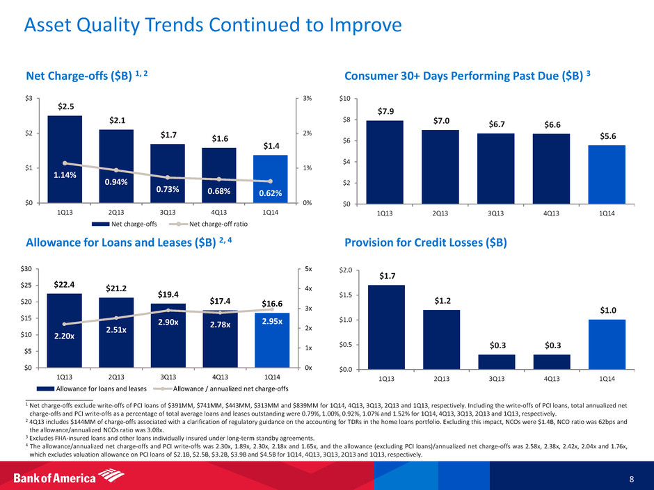 13.8 13.2 13.6 0.9 1.0 2.6 1.8 1.6 2.2 2.3 6.0 $19.5 $17.3 $22.2 $0 $5 $10 $15 $20 $25 1Q13 4Q13 1Q14 All Other Retirement-eligible costs LAS (excl. litigation) Litigation Expense Highlights ____________________ 1 Represents a non-GAAP financial measure. LAS noninterest expense was $7.4B, $3.0B and $4.6B in 1Q14, 4Q13 and 1Q13, respectively. LAS mortgage-related litigation expense was $5.8B, $1.2B and $2.0B in 1Q14, 4Q13 and 1Q13, respectively. 2 Represents a non-GAAP financial measure. • Total noninterest expense of $22.2B in 1Q14 increased from both 4Q13 and 1Q13 due to increased litigation expense • Litigation expense of $6.0B in 1Q14 included: – $3.6B associated with the previously announced FHFA settlement – $2.4B net increase in reserves primarily for previously disclosed legacy mortgage-related matters • 1Q14 and 1Q13 expense includes annual retirement-eligible incentive compensation costs • Excluding litigation and retirement-eligible incentive compensation costs 2, noninterest expense declined $1.2B from 1Q13, as LAS expense of $1.6B declined $1.0B from 1Q13 • All other expense of $13.6B in 1Q14 decreased $0.2B compared to 1Q13, but increased from 4Q13 due to seasonally higher incentive accruals aligned with sales and trading results • Expense program targets remain unchanged – Quarterly LAS expense, excluding litigation 2, expected to decline to $1.1B by 4Q14 – Quarterly New BAC cost savings of $2.0B expected to be achieved by mid-2015 Noninterest Expense ($B) Full-time Equivalent Employees (000's) 7 1 227.3 216.6 215.2 35.5 25.5 23.4 262.8 242.1 238.6 0 50 100 150 200 250 300 1Q13 4Q13 1Q14 FTEs (excluding LAS) LAS FTEs