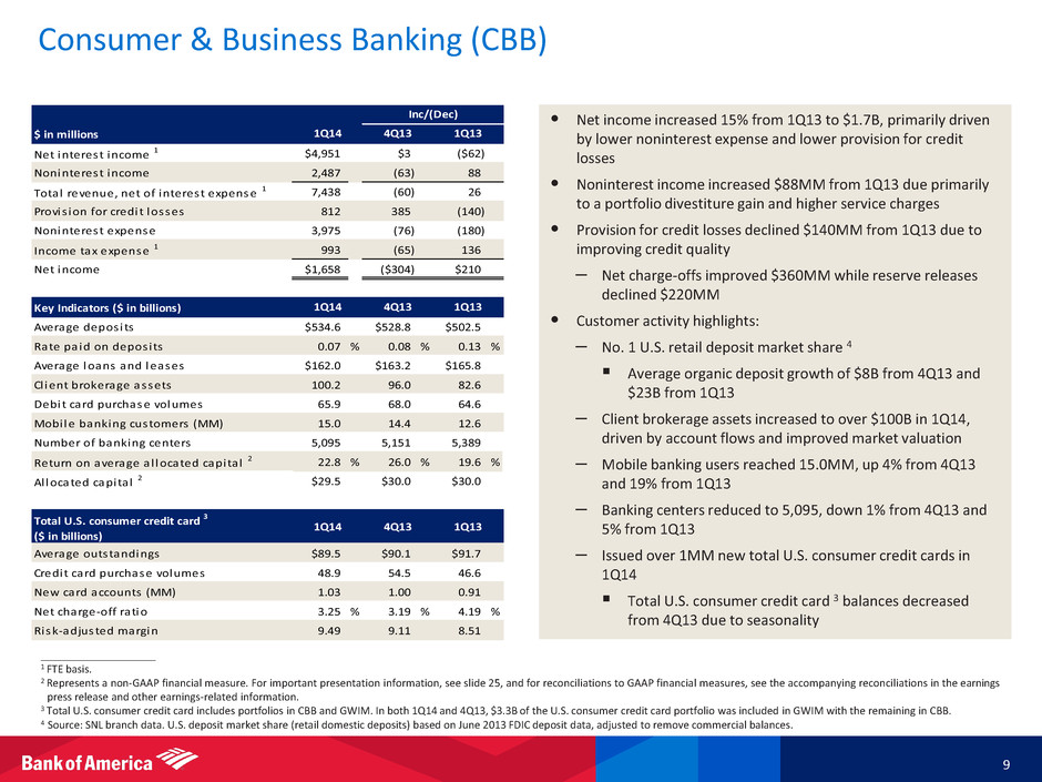 $22.4 $21.2 $19.4 $17.4 $16.6 2.20x 2.51x 2.90x 2.78x 2.95x 0x 1x 2x 3x 4x 5x $0 $5 $10 $15 $20 $25 $30 1Q13 2Q13 3Q13 4Q13 1Q14 T h o u s a n d s Allowance for loans and leases Allowance / annualized net charge-offs $2.5 $2.1 $1.7 $1.6 $1.4 1.14% 0.94% 0.73% 0.68% 0.62% 0% 1% 2% 3% $0 $1 $2 $3 1Q13 2Q13 3Q13 4Q13 1Q14 Net charge-offs Net charge-off ratio ____________________ 1 Net charge-offs exclude write-offs of PCI loans of $391MM, $741MM, $443MM, $313MM and $839MM for 1Q14, 4Q13, 3Q13, 2Q13 and 1Q13, respectively. Including the write-offs of PCI loans, total annualized net charge-offs and PCI write-offs as a percentage of total average loans and leases outstanding were 0.79%, 1.00%, 0.92%, 1.07% and 1.52% for 1Q14, 4Q13, 3Q13, 2Q13 and 1Q13, respectively. 2 4Q13 includes $144MM of charge-offs associated with a clarification of regulatory guidance on the accounting for TDRs in the home loans portfolio. Excluding this impact, NCOs were $1.4B, NCO ratio was 62bps and the allowance/annualized NCOs ratio was 3.08x. 3 Excludes FHA-insured loans and other loans individually insured under long-term standby agreements. 4 The allowance/annualized net charge-offs and PCI write-offs was 2.30x, 1.89x, 2.30x, 2.18x and 1.65x, and the allowance (excluding PCI loans)/annualized net charge-offs was 2.58x, 2.38x, 2.42x, 2.04x and 1.76x, which excludes valuation allowance on PCI loans of $2.1B, $2.5B, $3.2B, $3.9B and $4.5B for 1Q14, 4Q13, 3Q13, 2Q13 and 1Q13, respectively. Asset Quality Trends Continued to Improve 8 Net Charge-offs ($B) 1, 2 Allowance for Loans and Leases ($B) 2, 4 Provision for Credit Losses ($B) Consumer 30+ Days Performing Past Due ($B) 3 $1.7 $1.2 $0.3 $0.3 $1.0 $0.0 $0.5 $1.0 $1.5 $2.0 1Q13 2Q13 3Q13 4Q13 1Q14 $7.9 $7.0 $6.7 $6.6 $5.6 $0 $2 $4 $6 $8 $10 1Q13 2Q13 3Q13 4Q13 1Q14