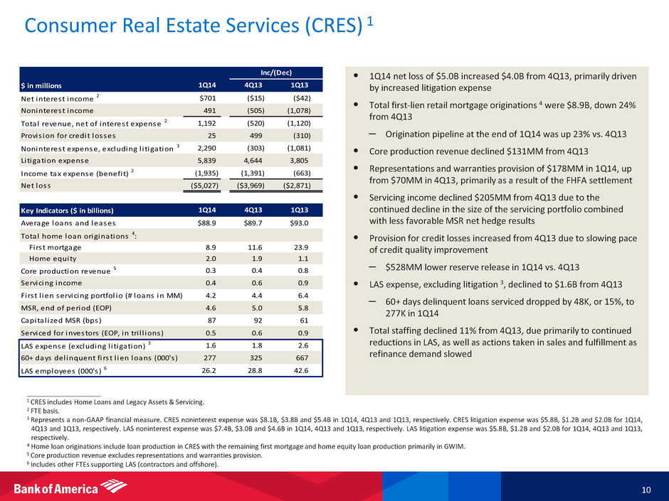 Consumer & Business Banking (CBB) 9 ____________________ 1 FTE basis. 2 Represents a non-GAAP financial measure. For important presentation information, see slide 25, and for reconciliations to GAAP financial measures, see the accompanying reconciliations in the earnings press release and other earnings-related information. 3 Total U.S. consumer credit card includes portfolios in CBB and GWIM. In both 1Q14 and 4Q13, $3.3B of the U.S. consumer credit card portfolio was included in GWIM with the remaining in CBB. 4 Source: SNL branch data. U.S. deposit market share (retail domestic deposits) based on June 2013 FDIC deposit data, adjusted to remove commercial balances. • [ Bullets to come ] • Net income increased 15% from 1Q13 to $1.7B, primarily driven by lower noninterest expense and lower provision for credit losses • Noninterest income increased $88MM from 1Q13 due primarily to a portfolio divestiture gain and higher service charges • Provision for credit losses declined $140MM from 1Q13 due to improving credit quality – Net charge-offs improved $360MM while reserve releases declined $220MM • Customer activity highlights: – No. 1 U.S. retail deposit market share 4 Average organic deposit growth of $8B from 4Q13 and $23B from 1Q13 – Client brokerage assets increased to over $100B in 1Q14, driven by account flows and improved market valuation – Mobile banking users reached 15.0MM, up 4% from 4Q13 and 19% from 1Q13 – Banking centers reduced to 5,095, down 1% from 4Q13 and 5% from 1Q13 – Issued over 1MM new total U.S. consumer credit cards in 1Q14 Total U.S. consumer credit card 3 balances decreased from 4Q13 due to seasonality $ in millions Net interest income 1 $4,951 $3 ($62) Noninterest income 2,487 (63) 88 Total revenue, net of interest expense 1 7,438 (60) 26 Provis ion for credit losses 812 385 (140) Noninterest expense 3,975 (76) (180) Income tax expense 1 993 (65) 136 Net income $1,658 ($304) $210 Key Indicators ($ in billions) Average depos its $534.6 $528.8 $502.5 Rate paid on depos its 0.07 % 0.08 % 0.13 % Average loans and leases $162.0 $163.2 $165.8 Cl ient brokerage assets 100.2 96.0 82.6 Debit card purchase volumes 65.9 68.0 64.6 Mobi le banking customers (MM) 15.0 14.4 12.6 Number of banking centers 5,095 5,151 5,389 Return on average a l located capita l 2 22.8 % 26.0 % 19.6 % Al located capita l 2 $29.5 $30.0 $30.0 Total U.S. consumer credit card 3 ($ in billions) Average outstandings $89.5 $90.1 $91.7 Credit card purchase volu es 48.9 54.5 46.6 New card accounts (MM) 1.03 1.00 0.91 Net charge-off ratio 3.25 % 3.19 % 4.19 % Risk-adjusted margin 9.49 9.11 8.51 1Q14 4Q13 1Q13 Inc/(Dec) 1Q14 4Q13 1Q13 1Q14 4Q13 1Q13