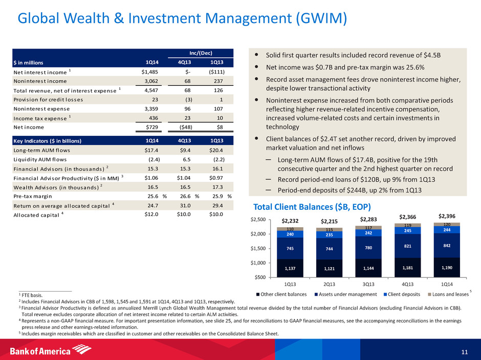 Consumer Real Estate Services (CRES) 1 10 • 1Q14 net loss of $5.0B increased $4.0B from 4Q13, primarily driven by increased litigation expense • Total first-lien retail mortgage originations 4 were $8.9B, down 24% from 4Q13 – Origination pipeline at the end of 1Q14 was up 23% vs. 4Q13 • Core production revenue declined $131MM from 4Q13 • Representations and warranties provision of $178MM in 1Q14, up from $70MM in 4Q13, primarily as a result of the FHFA settlement • Servicing income declined $205MM from 4Q13 due to the continued decline in the size of the servicing portfolio combined with less favorable MSR net hedge results • Provision for credit losses increased from 4Q13 due to slowing pace of credit quality improvement – $528MM lower reserve release in 1Q14 vs. 4Q13 • LAS expense, excluding litigation 3, declined to $1.6B from 4Q13 – 60+ days delinquent loans serviced dropped by 48K, or 15%, to 277K in 1Q14 • Total staffing declined 11% from 4Q13, due primarily to continued reductions in LAS, as well as actions taken in sales and fulfillment as refinance demand slowed ____________________ 1 CRES includes Home Loans and Legacy Assets & Servicing. 2 FTE basis. 3 Represents a non-GAAP financial measure. CRES noninterest expense was $8.1B, $3.8B and $5.4B in 1Q14, 4Q13 and 1Q13, respectively. CRES litigation expense was $5.8B, $1.2B and $2.0B for 1Q14, 4Q13 and 1Q13, respectively. LAS noninterest expense was $7.4B, $3.0B and $4.6B in 1Q14, 4Q13 and 1Q13, respectively. LAS litigation expense was $5.8B, $1.2B and $2.0B for 1Q14, 4Q13 and 1Q13, respectively. 4 Home loan originations include loan production in CRES with the remaining first mortgage and home equity loan production primarily in GWIM. 5 Core production revenue excludes representations and warranties provision. 6 Includes other FTEs supporting LAS (contractors and offshore). $ in millions Net interest income 2 $701 ($15) ($42) Noninterest income 491 (505) (1,078) Total revenue, net of interest expense 2 1,192 (520) (1,120) Provis ion for credit losses 25 499 (310) Noninterest expense, excluding l i tigation 3 2,290 (303) (1,081) Li tigation expense 5,839 4,644 3,805 Income tax expense (benefi t) 2 (1,935) (1,391) (663) Net loss ($5,027) ($3,969) ($2,871) Key Indicators ($ in billions) Average loans and leases $88.9 $89.7 $93.0 Total home loan originations 4 : Fi rs t mortgage 8.9 11.6 23.9 Home equity 2.0 1.9 1.1 Core production revenue 5 0.3 0.4 0.8 Servicing income 0.4 0.6 0.9 Firs t l ien servicing portfol io (# loans in MM) 4.2 4.4 6.4 MSR, end of period (EOP) 4.6 5.0 5.8 Capita l i zed MSR (bps) 87 92 61 Serviced for investors (EOP, in tri l l ions) 0.5 0.6 0.9 LAS expense (excluding l i tigation) 3 1.6 1.8 2.6 60+ days del inquent fi rs t l ien loans (000's ) 277 325 667 LAS employees (000's ) 6 26.2 28.8 42.6 1Q14 1Q13 Inc/(Dec) 1Q14 4Q13 1Q13 4Q13