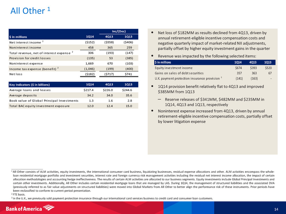 Global Markets 13 • [ Bullets to come ] ____________________ 1 FTE basis. 2 Represents a non-GAAP financial measure. During 1Q14, the management of structured liabilities and the associated DVA were moved into Global Markets from All Other to better align the performance risk of these instruments. As such, net DVA represents the combined total of net DVA on derivatives and structured liabilities. Prior periods have been reclassified to conform to current period presentation. Net DVA results were gains (losses) of $112MM, ($617)MM and ($145)MM for 1Q14, 4Q13 and 1Q13, respectively. 3 In addition to sales and trading revenue, Global Markets shares with Global Banking in certain deal economics from investment banking and loan origination activities. 4 For this presentation, sales and trading revenue excludes net DVA gains (losses), which represents a non-GAAP financial measure. Net DVA included in FICC revenue were gains (losses) of $80MM, ($535)MM and ($149)MM for 1Q14, 4Q13 and 1Q13, respectively. Net DVA included in equities revenue were gains (losses) of $32MM, ($82)MM and $4MM for 1Q14, 4Q13 and 1Q13, respectively. 5 VaR model uses historical simulation approach based on three years of historical data and an expected shortfall methodology equivalent to a 99% confidence level. Using a 95% confidence level, average VaR was $37MM, $39MM and $44MM for 1Q14, 4Q13 and 1Q13, respectively. 6 Represents a non-GAAP financial measure. For important presentation information, see slide 25, and for reconciliations to GAAP financial measures, see the accompanying reconciliations in the earnings press release and other earnings- related information. n/m = not meaningful • Net income of $1.3B improved versus both comparative periods – Excluding net DVA 2, net income of $1.2B, up modestly from 1Q13 and $894MM higher vs. 4Q13 • Excluding net DVA 2,4, sales and trading revenue of $4.1B decreased $47MM, or 1%, from 1Q13 and increased $1.1B or 37% vs. 4Q13 – FICC revenue decreased $51MM, or 2%, vs. 1Q13, driven by weaker results in Rates and Currencies due to declines in market volumes and volatility; revenue increased $870MM vs. 4Q13 from seasonally stronger results Adjusting for the 1Q13 impact of a monoline receivable write-down, revenue declined 15% vs. 1Q13 – Equities revenue was flat compared to 1Q13; revenue increased 28% vs. 4Q13 on seasonally higher client activity • Noninterest expense declined $202MM from 4Q13 and was flat to 1Q13; excluding litigation expense of $655MM in 4Q13, expenses increased $453MM due to seasonally higher incentive accruals aligned to sales and trading results $ in millions Net interest income 1 $1,000 ($143) ($110) Noninterest income (excl . net DVA) 2 3,903 1,219 88 Total revenue (excl . net DVA) 2, 3 4,903 1,076 (22) Net DVA 112 729 257 Total revenue, net of interest expense 1 5,015 1,805 235 Provis ion for credit losses 19 (85) 14 Noninterest expense 3,078 (202) 4 Income tax expense 1 608 739 19 Net income $1,310 $1,353 $198 Net income (excl . net DVA) 2 $1,240 $894 $37 Key Indicators ($ in billions) Average trading-related assets $437.1 $438.9 $504.3 Average loans and leases 63.7 66.5 52.7 IB fees 0.7 0.8 0.7 Sales and trading revenue 4.2 2.4 4.0 Sales and trading revenue (excl . net DVA) 2 4.1 3.0 4.2 FICC (excl . net DVA) 4 3.0 2.1 3.0 Equities (excl . net DVA) 4 1.2 0.9 1.1 Average VaR ($ in MM) 5 71 73 79 Return on average a l locat capita l 6 15.7 % n/m 15.1 % Excluding net DVA 2 14.8 4.6 % 16.3 Al located capita l 6 $34.0 $30.0 $30.0 Inc/(Dec) 1Q14 4Q13 1Q13 1Q14 4Q13 1Q13