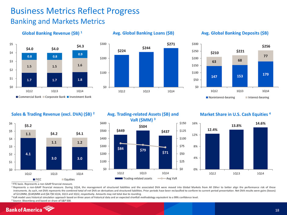 Business Metrics Reflect Progress Consumer Metrics 17 Avg. Consumer and Business Banking Deposits ($B) and Rate Paid (bps) Mobile Banking Active Accounts (units in MM) 1 Banking Centers 5,651 5,389 5,095 3,000 4,000 5,000 6,000 1Q12 1Q13 1Q14 $73.4 $82.6 $100.2 $0 $20 $40 $60 $80 $100 $120 1Q12 1Q13 1Q14 $464 $503 $535 20 13 7 0 10 20 30 40 $0 $100 $200 $300 $400 $500 $600 1Q12 1Q13 1Q14 Average deposits Rate paid on deposits (bps) 782 906 1,027 60% 64% 63% 0% 25% 50% 75% 100% 0 300 600 900 1,200 1Q12 1Q13 1Q14 New card issuance % w/existing relationship 9.7 12.6 15.0 6% 10% 0% 5% 10% 15% 20% 0 5 10 15 20 1Q12 1Q13 1Q14 Mobile banking active accounts Mobile % of total deposit transactions 1,105 1,137 1,190 678 745 842 240 240 244 101 110 120 $2,124 $2,232 $2,396 $500 $1,000 $1,500 $2,000 $2,500 1Q12 1Q13 1Q14 Other client balances Assets under management Client deposits Loans and leases Merrill Edge Brokerage Assets ($B) Total U.S. Consumer New Card Issuance (units in 000’s) GWIM Client Balances ($B) 2, 3 ____________________ 1 Mobile check deposits capability launched in mid-2012. 2 1Q12 client balances include $18.6B end of period deposits that were migrated to Consumer and Business Banking, primarily in 1Q13. 3 Loans and leases include margin receivables which are classified in customer and other receivables on the Consolidated Balance Sheet.