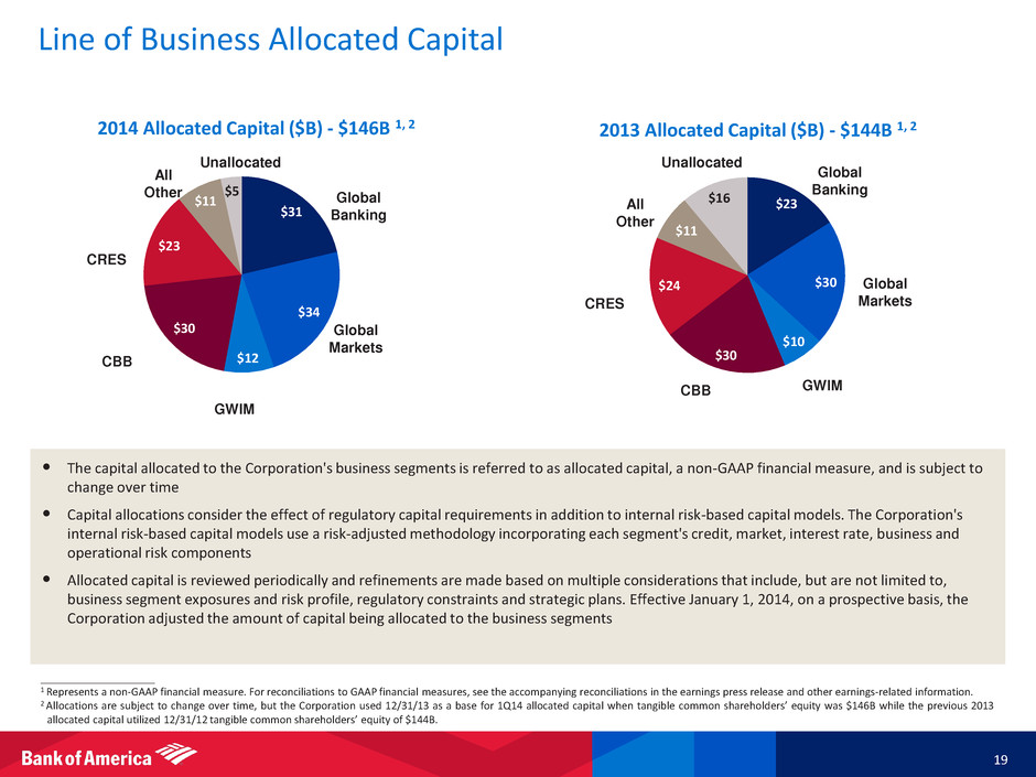 Business Metrics Reflect Progress Banking and Markets Metrics 18 ____________________ 1 FTE basis. Represents a non-GAAP financial measure. 2 Represents a non-GAAP financial measure. During 1Q14, the management of structured liabilities and the associated DVA were moved into Global Markets from All Other to better align the performance risk of these instruments. As such, net DVA represents the combined total of net DVA on derivatives and structured liabilities. Prior periods have been reclassified to conform to current period presentation. Net DVA results were gains (losses) of $112MM, ($145)MM and ($4.7)B 1Q14, 1Q13 and 1Q12, respectively. Amounts may not total due to rounding. 3 VaR model uses historical simulation approach based on three years of historical data and an expected shortfall methodology equivalent to a 99% confidence level. 4 Source: Bloomberg and based on share of S&P 500. Market Share in U.S. Cash Equities 4 Avg. Global Banking Loans ($B) Global Banking Revenue ($B) 1 Sales & Trading Revenue (excl. DVA) ($B) 2 Avg. Global Banking Deposits ($B) Avg. Trading-related Assets ($B) and VaR ($MM) 3 12.4% 13.8% 14.6% 0% 4% 8% 12% 16% 1Q12 1Q13 1Q14 1.7 1.7 1.8 1.5 1.5 1.6 0.8 0.8 0.9 $4.0 $4.0 $4.3 $0 $1 $2 $3 $4 $5 1Q12 1Q13 1Q14 Commercial Bank Corporate Bank Investment Bank 4.1 3.0 3.0 1.1 1.1 1.2 $5.2 $4.2 $4.1 $0 $1 $2 $3 $4 $5 $6 1Q12 1Q13 1Q14 FICC Equities 147 153 179 63 68 77 $210 $221 $256 $0 $50 $100 $150 $200 $250 $300 1Q12 1Q13 1Q14 Noninterest-bearing Interest-bearing $449 $504 $437 $84 $79 $71 $0 $25 $50 $75 $100 $125 $150 $0 $100 $200 $300 $400 $500 $600 1Q12 1Q13 1Q14 Trading-related assets Avg VaR $224 $244 $271 $0 $100 $200 $300 1Q12 1Q13 1Q14