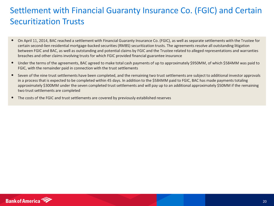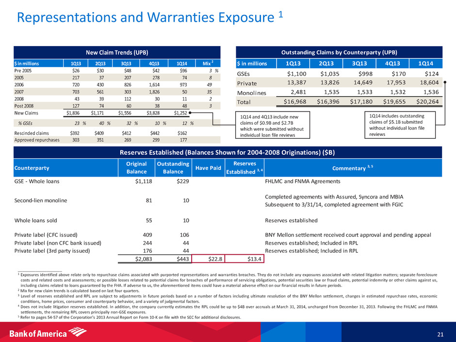 Settlement with Financial Guaranty Insurance Co. (FGIC) and Certain Securitization Trusts 20 • On April 11, 2014, BAC reached a settlement with Financial Guaranty Insurance Co. (FGIC), as well as separate settlements with the Trustee for certain second-lien residential mortgage-backed securities (RMBS) securitization trusts. The agreements resolve all outstanding litigation between FGIC and BAC, as well as outstanding and potential claims by FGIC and the Trustee related to alleged representations and warranties breaches and other claims involving trusts for which FGIC provided financial guarantee insurance • Under the terms of the agreements, BAC agreed to make total cash payments of up to approximately $950MM, of which $584MM was paid to FGIC, with the remainder paid in connection with the trust settlements • Seven of the nine trust settlements have been completed, and the remaining two trust settlements are subject to additional investor approvals in a process that is expected to be completed within 45 days. In addition to the $584MM paid to FGIC, BAC has made payments totaling approximately $300MM under the seven completed trust settlements and will pay up to an additional approximately $50MM if the remaining two trust settlements are completed • The costs of the FGIC and trust settlements are covered by previously established reserves