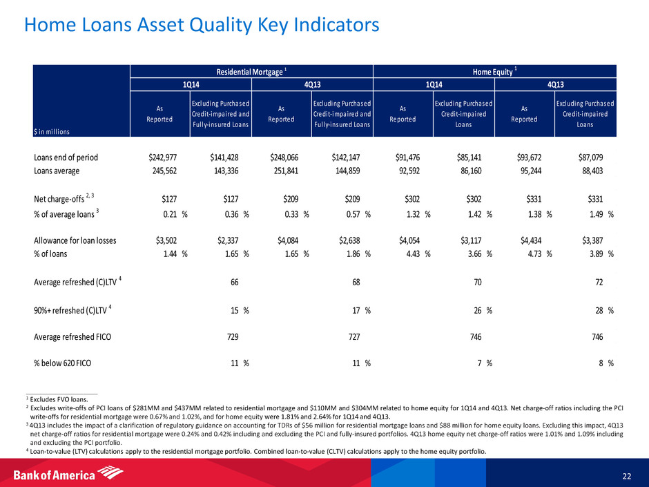 Representations and Warranties Exposure 1 21 ____________________ 1 Exposures identified above relate only to repurchase claims associated with purported representations and warranties breaches. They do not include any exposures associated with related litigation matters; separate foreclosure costs and related costs and assessments; or possible losses related to potential claims for breaches of performance of servicing obligations, potential securities law or fraud claims, potential indemnity or other claims against us, including claims related to loans guaranteed by the FHA. If adverse to us, the aforementioned items could have a material adverse effect on our financial results in future periods. 2 Mix for new claim trends is calculated based on last four quarters. 3 Level of reserves established and RPL are subject to adjustments in future periods based on a number of factors including ultimate resolution of the BNY Mellon settlement, changes in estimated repurchase rates, economic conditions, home prices, consumer and counterparty behavior, and a variety of judgmental factors. 4 Does not include litigation reserves established. In addition, the company currently estimates the RPL could be up to $4B over accruals at March 31, 2014, unchanged from December 31, 2013. Following the FHLMC and FNMA settlements, the remaining RPL covers principally non-GSE exposures. 5 Refer to pages 54-57 of the Corporation’s 2013 Annual Report on Form 10-K on file with the SEC for additional disclosures. $ in millions 1Q13 2Q13 3Q13 4Q13 1Q14 GSEs $1,100 $1,035 $998 $170 $124 Private 13,387 13,826 14,649 17,953 18,604 Monolines 2,481 1,535 1,533 1,532 1,536 Total $16,968 $16,396 $17,180 $19,655 $20,264 Outstanding Claims by Counterparty (UPB) $ in millions Pre 2005 $26 $30 $48 $42 $96 3 % 2005 217 37 207 278 74 8 2006 720 430 826 1,614 973 49 2007 703 561 303 1,826 50 35 2008 43 39 112 30 11 2 Post 2008 127 74 60 38 48 3 New Claims $1,836 $1,171 $1,556 $3,828 $1,252 % GSEs 23 % 40 % 32 % 10 % 12 % Rescinded claims $392 $409 $412 $442 $162 Approved repurchases 303 351 269 299 177 New Claim Trends (UPB) Mix 24Q13 1Q142Q131Q13 3Q13 Counterparty Original Balance Outstanding Balance Have Paid Reserves Established 3, 4 Commentary 3, 5 GSE - Whole loans $1,118 $229 FHLMC and FNMA Agreements S cond-lien monoline 81 10 Completed agreements with Assured, Syncora and MBIA Subsequent to 3/31/14, completed agreement with FGIC Whole loans sold 55 10 Reserves established Private lab l (CFC issued) 409 106 BNY Mellon settlement received court approval and pending appeal Pr vate label (non CFC bank issued) 244 44 Reserves established; Included in RPL Pri ate l bel ( rd party issued) 176 44 Reserves established; Included in RPL $2,083 $443 $22.8 $13.4 Reserves Established (Balances Shown for 2004-2008 Originations) ($B) 1Q14 and 4Q13 include new claims of $0.9B and $2.7B which were submitted without individual loan file reviews 1Q14 includes outstanding claims of $5.1B submitted without individual loan file reviews