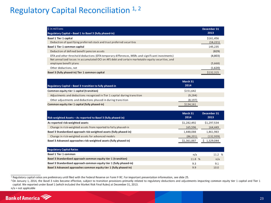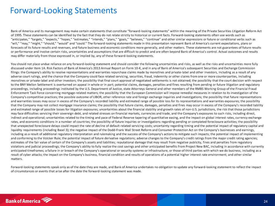 Regulatory Capital Reconciliation 1, 2 ____________________ 1 Regulatory capital ratios are preliminary until filed with the Federal Reserve on Form Y-9C. For important presentation information, see slide 25. 2 On January 1, 2014, the Basel 3 rules became effective, subject to transition provisions primarily related to regulatory deductions and adjustments impacting common equity tier 1 capital and Tier 1 capital. We reported under Basel 1 (which included the Market Risk Final Rules) at December 31, 2013. n/a = not applicable $ in mill ions Regulatory Capital – Basel 1 to Basel 3 (fully phased-in) Basel 1 Tier 1 capital $161,456 Deduction of qualifying preferred stock and trust preferred securities (16,221) Basel 1 Tier 1 common capital 145,235 Deduction of defined benefit pension assets (829) DTA and other threshold deductions (DTA temporary differences, MSRs and significant investments) (4,803) Net unrealized losses in accumulated OCI on AFS debt and certain marketable equity securities, and employee benefit plans (5,668) Other deductions, net (1,620) Basel 3 (fully phased-in) Tier 1 common capital $132,315 Regulatory Capital – Basel 3 transition to fully phased-in Common equity tier 1 capital (transition) $151,642 Adjustments and deductions recognized in Tier 1 capital during transition (9,284) Other adjustments and deductions phased in during transition (8,197) Common equity tier 1 capital (fully phased-in) $134,161 Risk-weighted Assets – As reported to Basel 3 (fully phased-in) As reported risk-weighted assets $1,282,492 $1,297,534 Change in risk-weighted assets from reported to fully phased-in 165,596 164,449 Basel 3 Standardized approach risk-weighted assets (fully phased-in) 1,448,088 1,461,983 Change in risk-weighted assets for advanced models (86,201) (132,939) Basel 3 Advanced approaches risk-weighted assets (fully phased-in) $1,361,887 1,329,044$ Regulatory Capital Ratios Basel 1 Tier 1 common n/a 11.2 % Basel 3 Standardized approach common equity tier 1 (transition) 11.8 % n/a Basel 3 Standardized approach common equity tier 1 (fully phased-in) 9.3 9.1 Basel 3 Advanced approaches common equity tier 1 (fully phased-in) 9.9 10.0 March 31 2014 March 31 2014 December 31 2013 December 31 2013 23