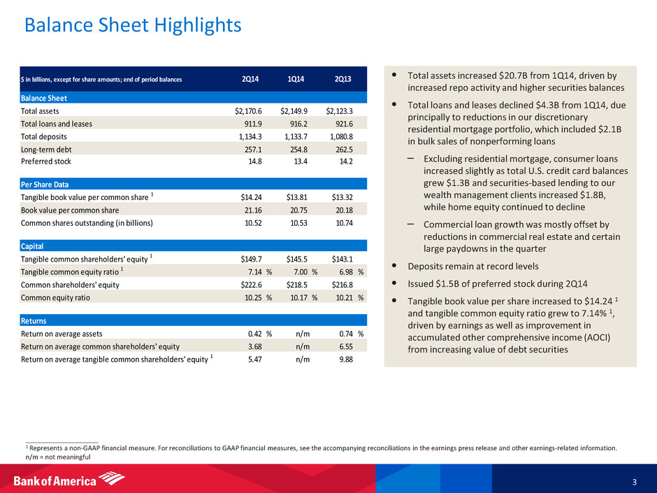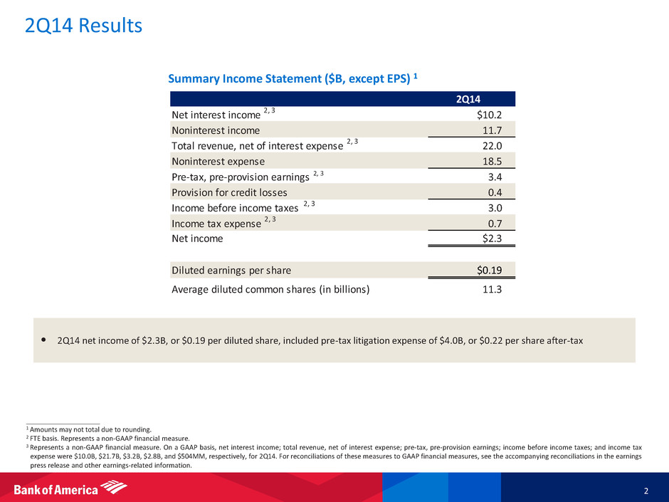 2Q14 Results 2 ____________________ 1 Amounts may not total due to rounding. 2 FTE basis. Represents a non-GAAP financial measure. 3 Represents a non-GAAP financial measure. On a GAAP basis, net interest income; total revenue, net of interest expense; pre-tax, pre-provision earnings; income before income taxes; and income tax expense were $10.0B, $21.7B, $3.2B, $2.8B, and $504MM, respectively, for 2Q14. For reconciliations of these measures to GAAP financial measures, see the accompanying reconciliations in the earnings press release and other earnings-related information. 2Q14 Net interest income 2, 3 $10.2 Noninterest income 11.7 Total revenue, net of interest expense 2, 3 22.0 Noninterest expense 18.5 Pre-tax, pre-provision earnings 2, 3 3.4 Provision for credit losses 0.4 Income before income taxes 2, 3 3.0 Income tax expense 2, 3 0.7 Net income $2.3 Diluted earnings per share $0.19 Average diluted common shares (in billions) 11.3 Summary Income Statement ($B, except EPS) 1 • 2Q14 net income of $2.3B, or $0.19 per diluted share, included pre-tax litigation expense of $4.0B, or $0.22 per share after-tax