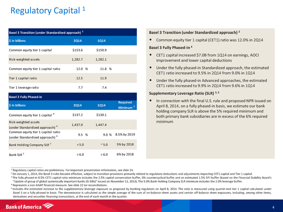 ____________________ 1 Represents a non-GAAP financial measure. For reconciliations to GAAP financial measures, see the accompanying reconciliations in the earnings press release and other earnings-related information. n/m = not meaningful Balance Sheet Highlights 3 • Total assets increased $20.7B from 1Q14, driven by increased repo activity and higher securities balances • Total loans and leases declined $4.3B from 1Q14, due principally to reductions in our discretionary residential mortgage portfolio, which included $2.1B in bulk sales of nonperforming loans – Excluding residential mortgage, consumer loans increased slightly as total U.S. credit card balances grew $1.3B and securities-based lending to our wealth management clients increased $1.8B, while home equity continued to decline – Commercial loan growth was mostly offset by reductions in commercial real estate and certain large paydowns in the quarter • Deposits remain at record levels • Issued $1.5B of preferred stock during 2Q14 • Tangible book value per share increased to $14.24 1 and tangible common equity ratio grew to 7.14% 1, driven by earnings as well as improvement in accumulated other comprehensive income (AOCI) from increasing value of debt securities $ in billions, except for share amounts; end of period balances Balance Sheet Total assets $2,170.6 $2,149.9 $2,123.3 Total loans and leases 911.9 916.2 921.6 Total deposits 1,134.3 1,133.7 1,080.8 Long-term debt 257.1 254.8 262.5 Preferred stock 14.8 13.4 14.2 Per Share Data Tangible book value per common share 1 $14.24 $13.81 $13.32 Book value per common share 21.16 20.75 20.18 Common shares outstanding (in billions) 10.52 10.53 10.74 Capital Tangible common shareholders' equity 1 $149.7 $145.5 $143.1 Tangible common equity ratio 1 7.14 % 7.00 % 6.98 % Common shareholders' equity $222.6 $218.5 $216.8 Common equity ratio 10.25 % 10.17 % 10.21 % Returns Return on average assets 0.42 % n/m 0.74 % Return on average c mmon shareholders' equity 3.68 n/m 6.55 Return on average tangible common shareholders' equity 1 5.47 n/m 9.88 2Q14 1Q14 2Q13