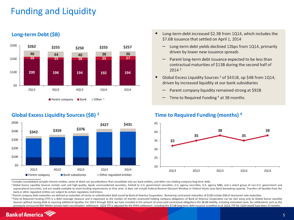 Basel 3 Transition (under Standardized approach) 2 • Common equity tier 1 capital (CET1) ratio was 12.0% in 2Q14 Basel 3 Fully Phased-in 4 • CET1 capital increased $7.0B from 1Q14 on earnings, AOCI improvement and lower capital deductions • Under the fully phased-in Standardized approach, the estimated CET1 ratio increased to 9.5% in 2Q14 from 9.0% in 1Q14 • Under the fully phased-in Advanced approaches, the estimated CET1 ratio increased to 9.9% in 2Q14 from 9.6% in 1Q14 Supplementary Leverage Ratio (SLR) 3, 5 • In connection with the final U.S. rule and proposed NPR issued on April 8, 2014, on a fully phased-in basis, we estimate our bank holding company SLR is above the 5% required minimum and both primary bank subsidiaries are in excess of the 6% required minimum Regulatory Capital 1 4 ____________________ 1 Regulatory capital ratios are preliminary. For important presentation information, see slide 24. 2 On January 1, 2014, the Basel 3 rules became effective, subject to transition provisions primarily related to regulatory deductions and adjustments impacting CET1 capital and Tier 1 capital. 3 The fully phased-in 8.5% CET1 capital ratio minimum includes the 2.5% capital conservation buffer, 0% countercyclical buffer and an estimated 1.5% SIFI buffer (based on the Financial Stability Board’s “Update of group of global systemically important banks (G-SIBs)” issued on November 11, 2013). The 5.0% Bank Holding Company SLR minimum includes the 2.0% leverage buffer. 4 Represents a non-GAAP financial measure. See slide 22 tor reconciliations. 5 Includes the estimated increase to the supplementary leverage exposure as proposed by banking regulators on April 8, 2014. The ratio is measured using quarter-end tier 1 capital calculated under Basel 3 on a fully phased-in basis. The denominator is calculated as the simple average of the sum of on-balance sheet assets and certain off-balance sheet exposures, including, among other items, derivatives and securities financing transactions, at the end of each month in the quarter. Basel 3 Transition (under Standardized approach) 2 $ in billions Common equity tier 1 capital $153.6 $150.9 Risk-weighted assets 1,282.7 1,282.1 Common equity tier 1 capital ratio 12.0 % 11.8 % Tier 1 capital ratio 12.5 11.9 Tier 1 leverage ratio 7.7 7.4 Basel 3 Fully Phased-in $ in billions Common equity tier 1 capital 4 $137.2 $130.1 Risk-weighted assets (under Standardized approach) 4 1,437.0 1,447.4 Common equity tier 1 capital ratio (under Standardized approach) 4 9.5 % 9.0 % Bank Holding Company SLR 5 > 5.0 ~ 5.0 Bank SLR 5 > 6.0 > 6.0 8.5% by 2019 5% by 2018 6% by 2018 2Q14 1Q14 2Q14 1Q14 Required Minimum 3