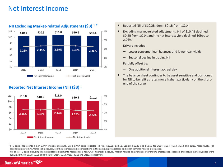 Funding and Liquidity 5 Global Excess Liquidity Sources ($B) 2 • Long-term debt increased $2.3B from 1Q14, which includes the $7.6B issuance that settled on April 1, 2014 – Long-term debt yields declined 12bps from 1Q14, primarily driven by lower new issuance spreads – Parent long-term debt issuance expected to be less than contractual maturities of $13B during the second half of 2014 3 • Global Excess Liquidity Sources 2 of $431B, up $4B from 1Q14, driven by increased liquidity at our bank subsidiaries – Parent company liquidity remained strong at $92B – Time to Required Funding 4 at 38 months 1 Includes consolidated variable interest entities, some of which are securitizations that consolidate into our bank entities, and other non-holding company long-term debt. 2 Global Excess Liquidity Sources include cash and high-quality, liquid, unencumbered securities, limited to U.S. government securities, U.S. agency securities, U.S. agency MBS, and a select group of non-U.S. government and supranational securities, and are readily available to meet funding requirements as they arise. It does not include Federal Reserve Discount Window or Federal Home Loan Bank borrowing capacity. Transfers of liquidity from the bank or other regulated entities are subject to certain regulatory restrictions. 3 Parent company debt maturities are defined as maturities of senior or subordinated debt issued by Bank of America Corporation. Remaining contractual maturities of $13B include $3B of structured note maturities. 4 Time to Required Funding (TTF) is a debt coverage measure and is expressed as the number of months unsecured holding company obligations of Bank of America Corporation can be met using only its Global Excess Liquidity Sources without issuing debt or sourcing additional liquidity. For 2Q13 through 2Q14, we have included in the amount of unsecured contractual obligations the $8.6B liability, including estimated costs, for settlements such as the previously announced BNY Mellon private-label securitization settlement. 1Q14 TTF is adjusted for the FHFA settlement. Including the $7.6B long-term debt issuance unsettled as of 1Q14, TTF for 1Q14 would have been 37 months. Long-term Debt ($B) Time to Required Funding (months) 4 $342 $359 $376 $427 $431 $0 $100 $200 $300 $400 $500 2Q13 3Q13 4Q13 1Q14 2Q14 Parent company Bank subsidiaries Other regulated entities 200 196 194 192 194 16 15 16 25 27 46 44 40 38 36 $262 $255 $250 $255 $257 $0 $100 $200 $300 2Q13 3Q13 4Q13 1Q14 2Q14 Parent company Bank Other 32 35 38 35 38 20 25 30 35 40 45 2Q13 3Q13 4Q13 1Q14 2Q14 1