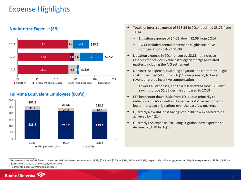 Net Interest Income 6 • Reported NII of $10.2B, down $0.1B from 1Q14 • Excluding market-related adjustments, NII of $10.4B declined $0.2B from 1Q14, and the net interest yield declined 10bps to 2.26% Drivers included: – Lower consumer loan balances and lower loan yields – Seasonal decline in trading NII Partially offset by: – One additional interest accrual day • The balance sheet continues to be asset sensitive and positioned for NII to benefit as rates move higher, particularly on the short- end of the curve ____________________ 1 FTE basis. Represents a non-GAAP financial measure. On a GAAP basis, reported NII was $10.0B, $10.1B, $10.8B, $10.3B and $10.5B for 2Q14, 1Q14, 4Q13, 3Q13 and 2Q13, respectively. For reconciliations to GAAP financial measures, see the accompanying reconciliations in the earnings press release and other earnings-related information. 2 NII on a FTE basis excluding market-related adjustments represents a non-GAAP financial measure. Market-related adjustments of premium amortization expense and hedge ineffectiveness were ($0.2)B, ($0.3)B, $0.2B, $0.0B and $0.4B for 2Q14, 1Q14, 4Q13, 3Q13 and 2Q13, respectively. Reported Net Interest Income (NII) ($B) 1 NII Excluding Market-related Adjustments ($B) 1, 2 $10.8 $10.5 $11.0 $10.3 $10.2 2.35% 2.33% 2.44% 2.29% 2.22% 0% 1% 2% 3% 4% $0 $2 $4 $6 $8 $10 $12 2Q13 3Q13 4Q13 1Q14 2Q14 Net interest income Net interest yield $10.4 $10.5 $10.8 $10.6 $10.4 2.28% 2.35% 2.39% 2.36% 2.26% 0% 1% 2% 3% 4% $0 $2 $4 $6 $8 $10 $12 2Q13 3Q13 4Q13 1Q14 2Q14 Net interest income Net interest yield