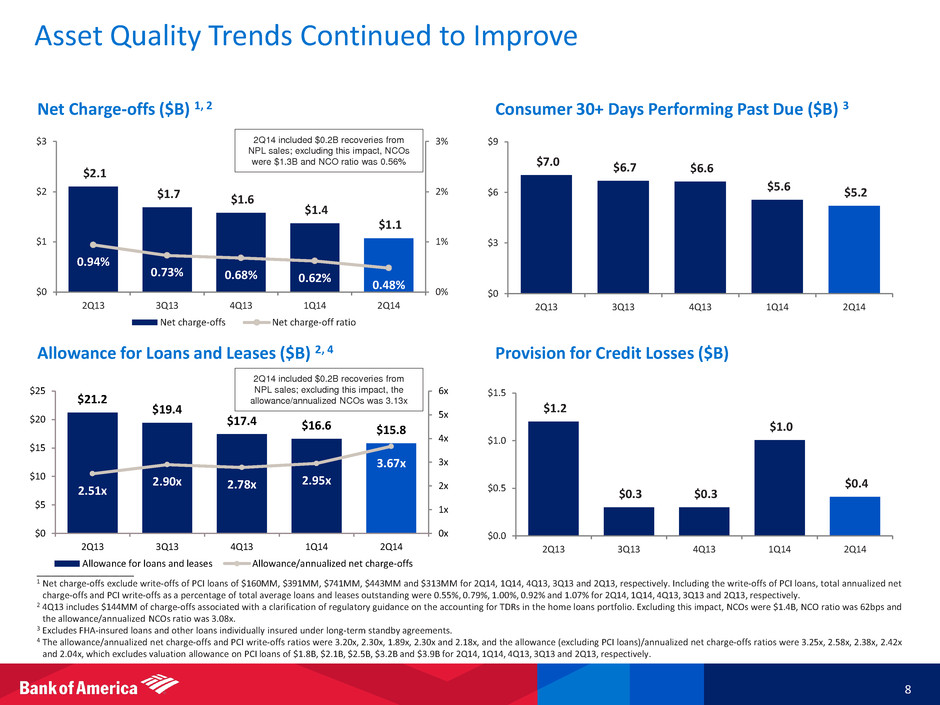 13.2 13.6 13.1 1.0 2.3 1.6 1.4 0.5 6.0 4.0 $16.0 $22.2 $18.5 $0 $5 $10 $15 $20 $25 2Q13 1Q14 2Q14 All Other Retirement-eligible costs LAS (excl. litigation) Litigation Expense Highlights ____________________ 1 Represents a non-GAAP financial measure. LAS noninterest expense was $5.2B, $7.4B and $2.5B in 2Q14, 1Q14 and 2Q13, respectively. LAS mortgage-related litigation expense was $3.8B, $5.8B and $215MM in 2Q14, 1Q14 and 2Q13, respectively. 2 Represents a non-GAAP financial measure. • Total noninterest expense of $18.5B in 2Q14 declined $3.7B from 1Q14 – Litigation expense of $4.0B, down $2.0B from 1Q14 – 1Q14 included annual retirement-eligible incentive compensation costs of $1.0B • Litigation expense in 2Q14 driven by $3.8B net increase in reserves for previously disclosed legacy mortgage-related matters, including the AIG settlement • Noninterest expense, excluding litigation and retirement-eligible costs 2, declined $0.7B from 1Q14, due primarily to lower revenue-related incentive compensation – Lower LAS expenses, and to a lesser extent New BAC cost savings, drove $1.0B decline compared to 2Q13 • FTE headcount down 2.3% from 1Q14, due primarily to reductions in LAS as well as Home Loans staff in response to lower mortgage originations over the past few quarters • Quarterly New BAC cost savings of $2.0B now expected to be achieved by 4Q14 • Quarterly LAS expense, excluding litigation, now expected to decline to $1.1B by 1Q15 Noninterest Expense ($B) Full-time Equivalent Employees (000's) 7 1 225.5 215.2 213.1 31.7 23.4 20.1 257.2 238.6 233.2 0 50 100 150 200 250 300 2Q13 1Q14 2Q14 FTEs (excluding LAS) LAS FTEs