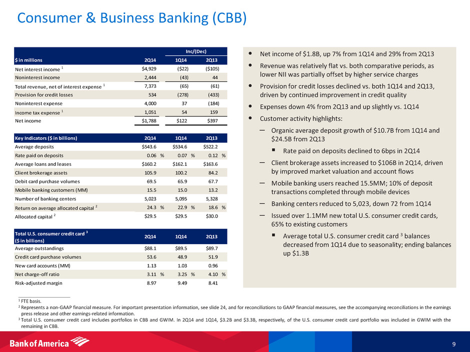 $21.2 $19.4 $17.4 $16.6 $15.8 2.51x 2.90x 2.78x 2.95x 3.67x 0x 1x 2x 3x 4x 5x 6x $0 $5 $10 $15 $20 $25 2Q13 3Q13 4Q13 1Q14 2Q14 T h o u s a n d s Allowance for loans and leases Allowance/annualized net charge-offs $2.1 $1.7 $1.6 $1.4 $1.1 0.94% 0.73% 0.68% 0.62% 0.48% 0% 1% 2% 3% $0 $1 $2 $3 2Q13 3Q13 4Q13 1Q14 2Q14 Net charge-offs Net charge-off ratio ____________________ 1 Net charge-offs exclude write-offs of PCI loans of $160MM, $391MM, $741MM, $443MM and $313MM for 2Q14, 1Q14, 4Q13, 3Q13 and 2Q13, respectively. Including the write-offs of PCI loans, total annualized net charge-offs and PCI write-offs as a percentage of total average loans and leases outstanding were 0.55%, 0.79%, 1.00%, 0.92% and 1.07% for 2Q14, 1Q14, 4Q13, 3Q13 and 2Q13, respectively. 2 4Q13 includes $144MM of charge-offs associated with a clarification of regulatory guidance on the accounting for TDRs in the home loans portfolio. Excluding this impact, NCOs were $1.4B, NCO ratio was 62bps and the allowance/annualized NCOs ratio was 3.08x. 3 Excludes FHA-insured loans and other loans individually insured under long-term standby agreements. 4 The allowance/annualized net charge-offs and PCI write-offs ratios were 3.20x, 2.30x, 1.89x, 2.30x and 2.18x, and the allowance (excluding PCI loans)/annualized net charge-offs ratios were 3.25x, 2.58x, 2.38x, 2.42x and 2.04x, which excludes valuation allowance on PCI loans of $1.8B, $2.1B, $2.5B, $3.2B and $3.9B for 2Q14, 1Q14, 4Q13, 3Q13 and 2Q13, respectively. Asset Quality Trends Continued to Improve 8 Net Charge-offs ($B) 1, 2 Allowance for Loans and Leases ($B) 2, 4 Provision for Credit Losses ($B) Consumer 30+ Days Performing Past Due ($B) 3 $1.2 $0.3 $0.3 $1.0 $0.4 $0.0 $0.5 $1.0 $1.5 2Q13 3Q13 4Q13 1Q14 2Q14 $7.0 $6.7 $6.6 $5.6 $5.2 $0 $3 $6 $9 2Q13 3Q13 4Q13 1Q14 2Q14 2Q14 included $0.2B recoveries from NPL sales; excluding this impact, NCOs were $1.3B and NCO ratio was 0.56% 2Q14 included $0.2B recoveries from NPL sales; excluding this impact, the allowance/annualized NCOs was 3.13x